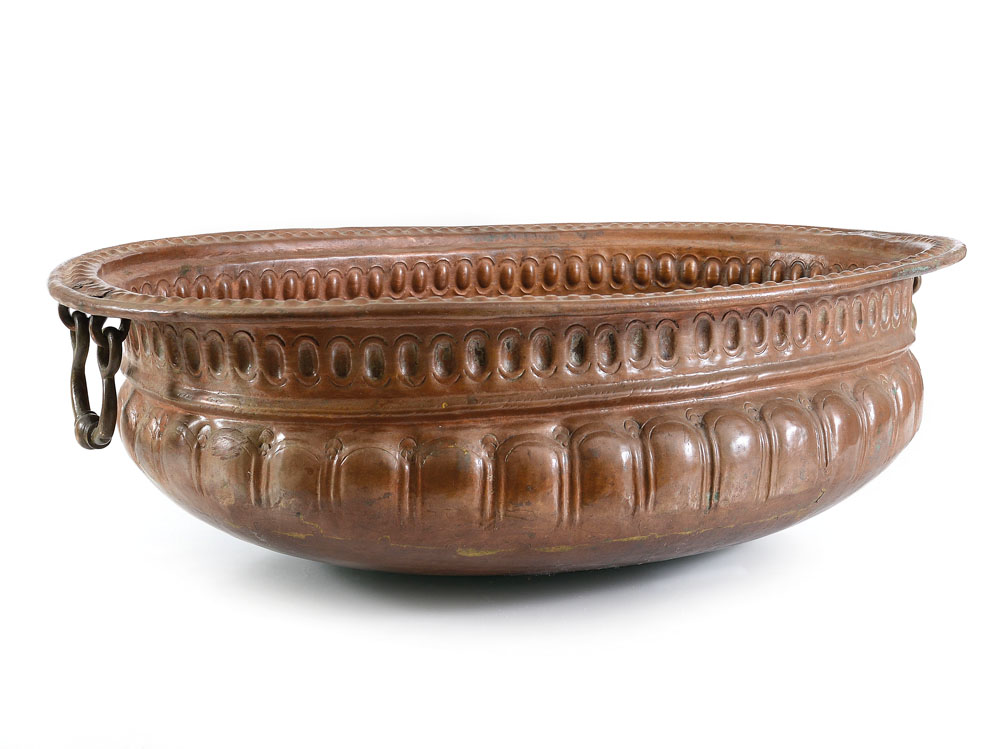 OGGETTISTICA VARIA GRANDE BACILE IN RAME SBALZATO, XVII SECOLO, ovale a due...