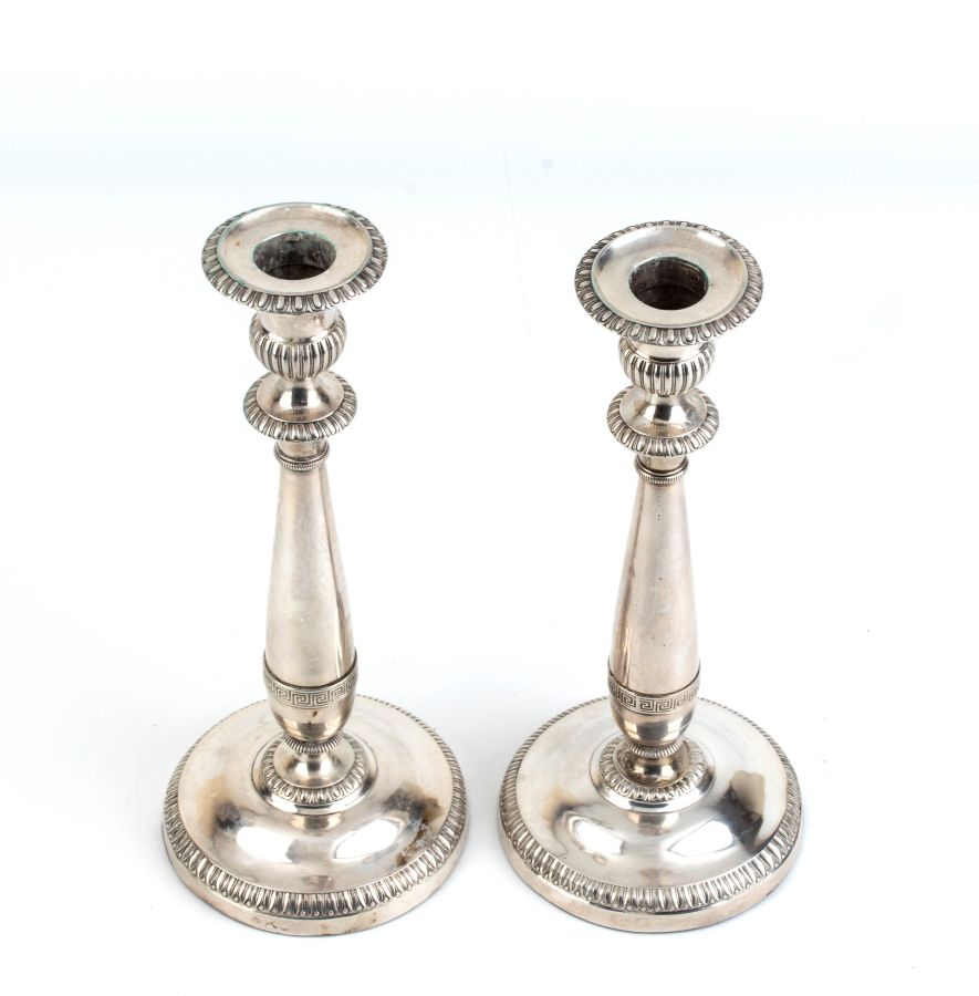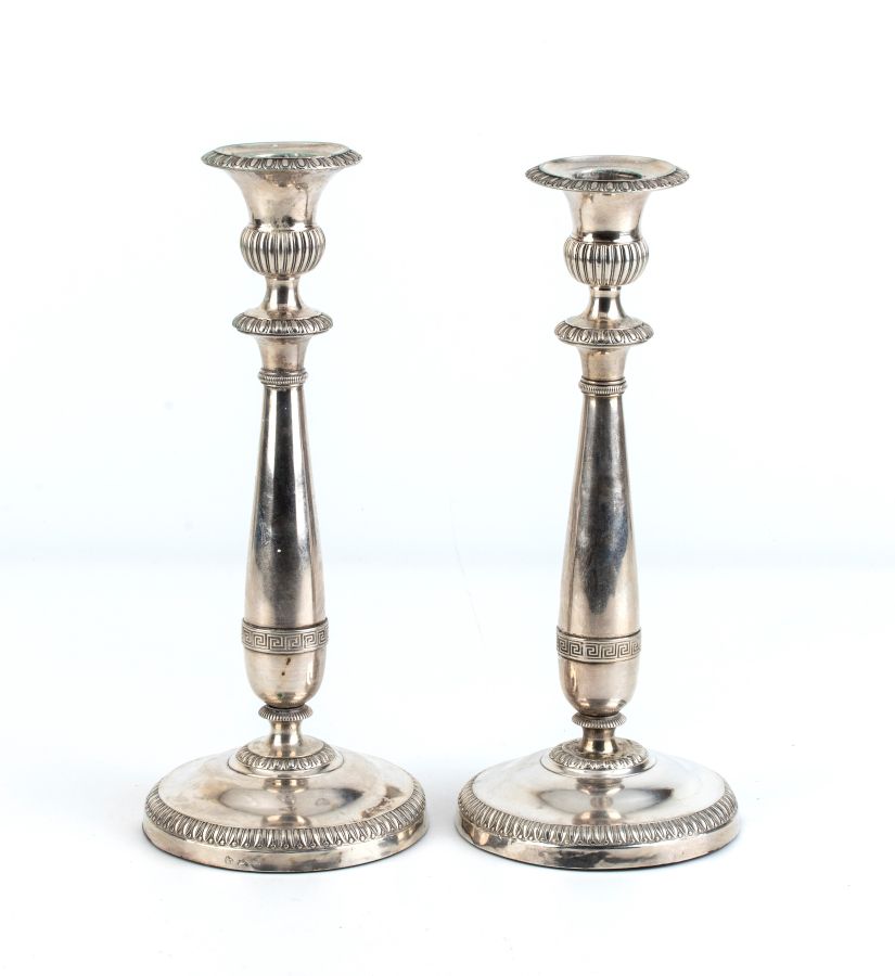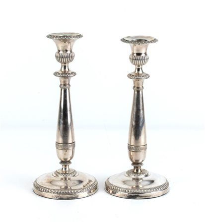 Panizza Tommaso (Lierna di Como, 7/12/1805 - 1868) Coppia di candelieri italiani in argento Milano, 1837-1868 Peso totale: 862 gr.