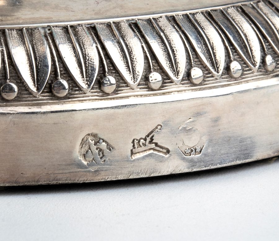 Argento 800/1000, punzonate con i marchi in uso a Milano, Lombardo-Veneto tra il 1812 ed il 1872 e con il marchio dell'argentiere Tommaso Panizza, attivo il marchio della "capra che allatta" in Contrada degli orefici 3199 dal 1837 fino al 1868, anno della sua morte.