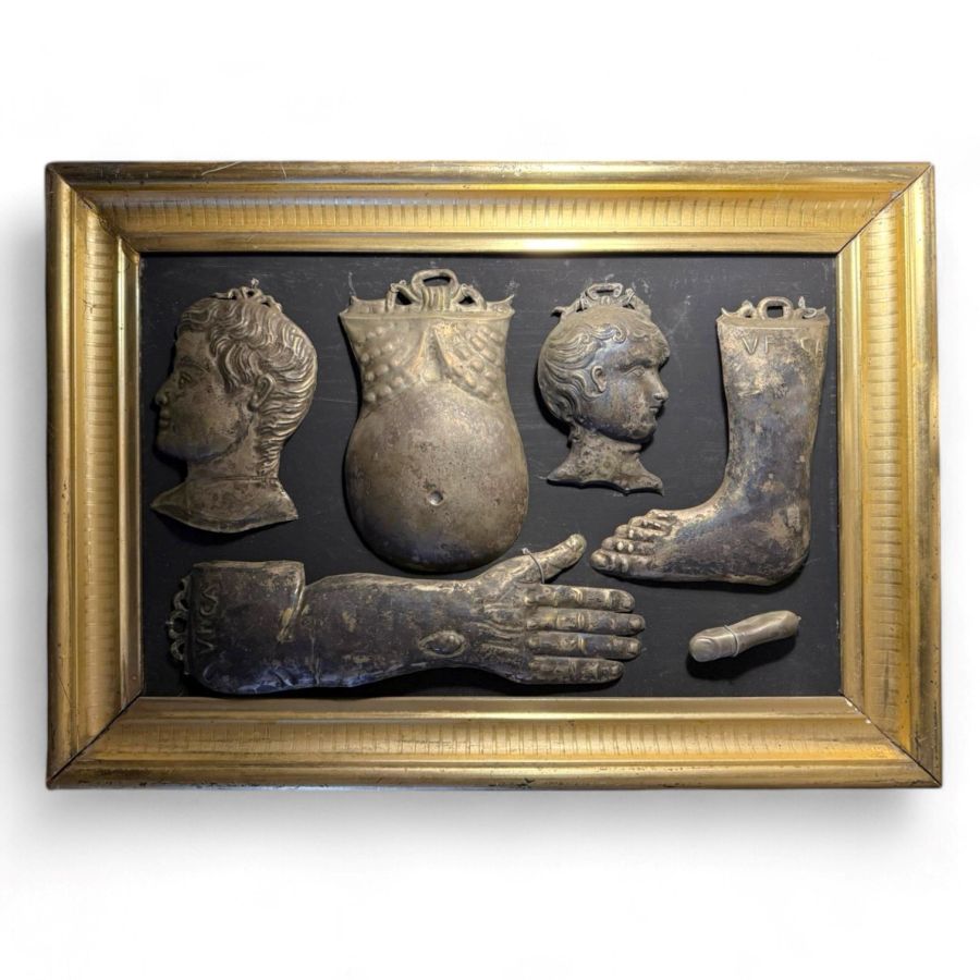 Altezza x larghezza teca: 41 x 59 cm. forma di arte popolare, rappresentano testimonianze di devozione e religiosità legati spesso a eventi miracolosi o richieste di miracolo. I temi rappresentati sono categorie di voti come guarigioni, incidenti e calamità naturali e i loro committenti spaziano tra le classi sociali. Il lotto in questione è composto da 6 ex-voto raffiguranti rispettivamente la categoria delle tavolette votive anatomiche: un braccio, una gamba, due teste, un dito e un busto.Lo spazio della tavoletta, come anche in questo caso, è diviso solitamente in due parti distinte: una dedica alla divinità, con una sigla votiva o scritta per esteso o una rappresentazione, e la raffigurazione della parte miracolata (nel caso di una guarigione) o del miracolo (nel caso di calamità). Pertanto, ritroviamo riportate, intorno alle raffigurazioni, le lettere V.F. - G.A., sigle votive per "Voto Fatto - Grazia Avuta".