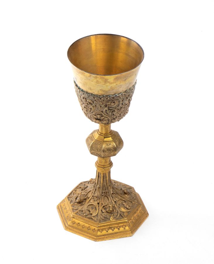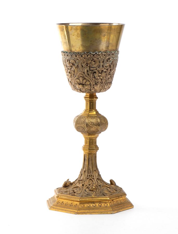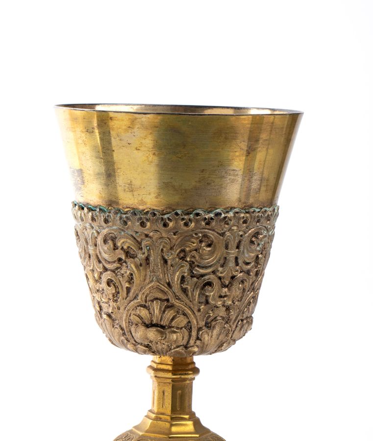 Altezza x larghezza x profondità: 24 x 11 x 11 cm. Peso: 545 gr circa. base ottagonale decorata con motivi vegetali e i quattro simboli degli evangelisti, il toro, simbolo dell'evangelista Luca, l'angelo, simbolo di Matteo, l'aquila di San Giovanni e, infine il leone di San Marco; fusto architettonico con nodo geometrico decorato con conchiglie incise; coppa liscia decorata nella parte inferiore con motivi vegetali.