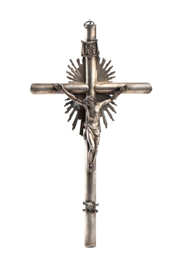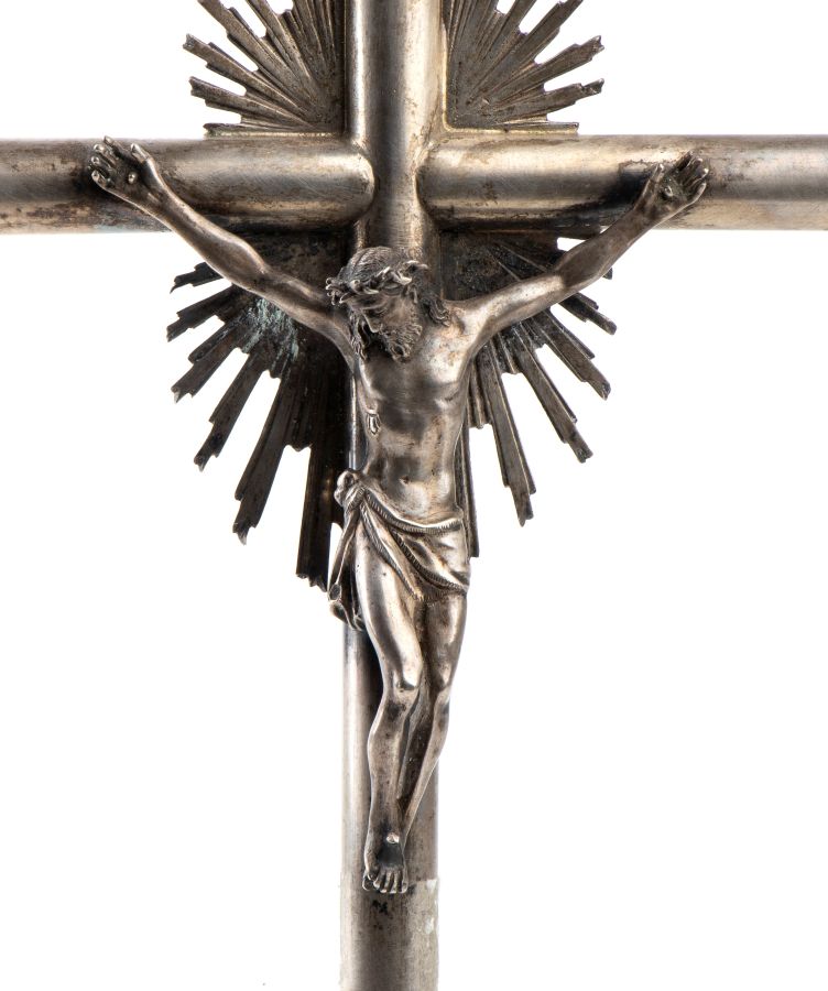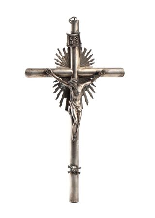 Altezza x larghezza: 29 x 15,5 cm. Peso 201 gr Corpus Christi posto su una croce lignea tubolare liscia; nella parte superiore il cartiglio con il Titulus Crucis I.N.R.I. (Iesus Nazarenus Rex Iudeorum, che si traduce letteralmente in “Gesù nazareno, re dei giudei”).