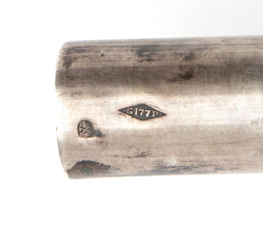 Punzonato con i marchi camerali in uso a Roma dopo il 1815 per l'argento al titolo al titolo di 10 once e 16 denari (889/1000) e con il marchio dell'argentiere Giuseppe Pocaterra (1869-1872).