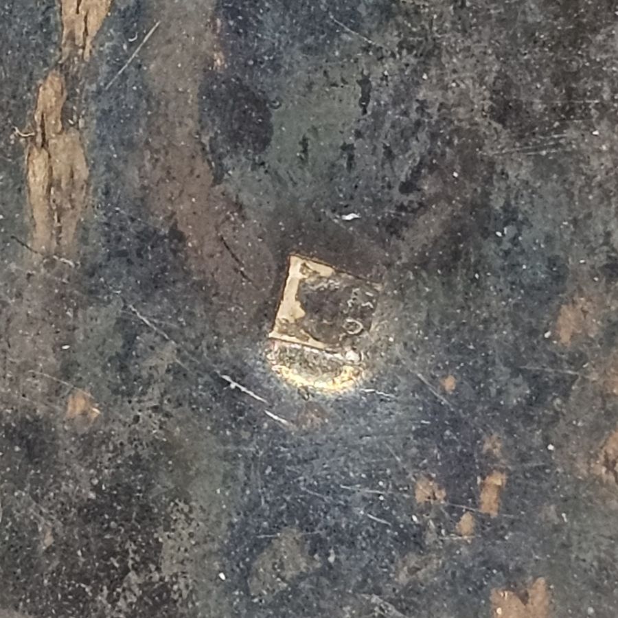 Argento 833/1000, punzonato con il marchio in uso alla corporazione degli orefici di Napoli per gli oggetti in argento al titolo di 833/1000 o 10 once, in uso dal 1832-1872, assaggiatore Paolo De Blasio (1832-1835).