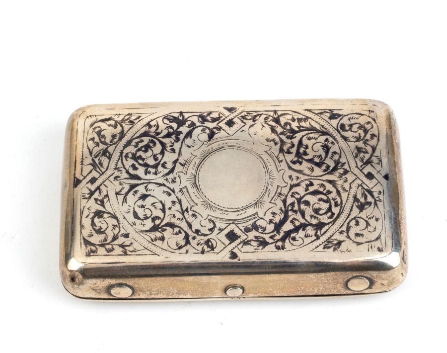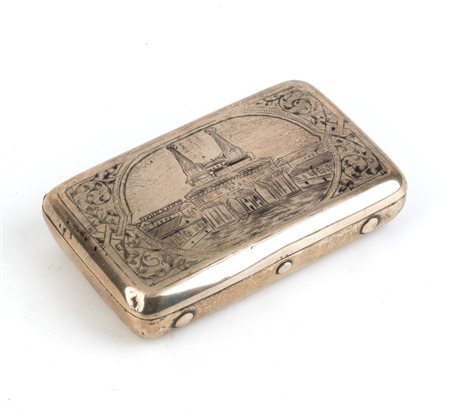 Tabacchiera russa in argento e niello Mosca, 1880-1890 Altezza x larghezza x profondità: 2 x 10,5 x 6 cm. Peso: 130 gr circa.