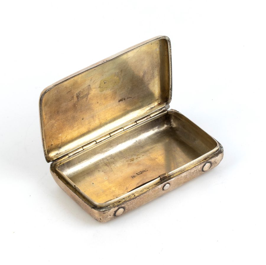 Altezza x larghezza x profondità: 2 x 10,5 x 6 cm. Peso: 130 gr circa. di forma rettangolare ad angoli stondati, coperchio incernierato e doratura interna, interamente niellata con motivi floreali; sul fronte, entro riserva ovale, la rappresentazione di una piazza, probabilmente di Mosca.