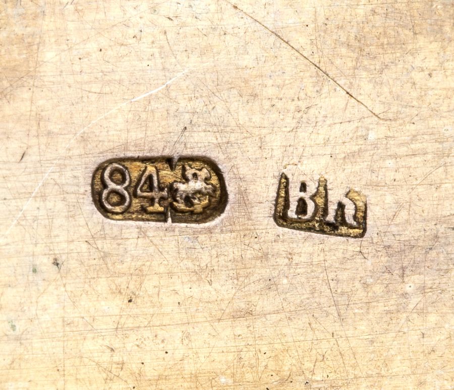 Punzonata con il marchio polifunzionale per l'argento al titolo di 84 zolotniks (875/1000) in uso a Mosca tra il 1880 e il 1890 circa, e con il marchio di un argentiere non identificato.