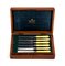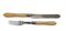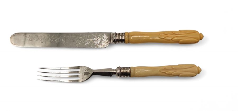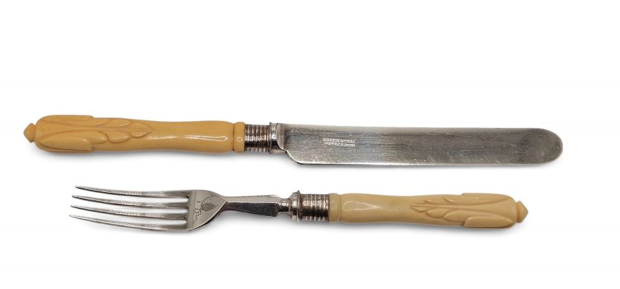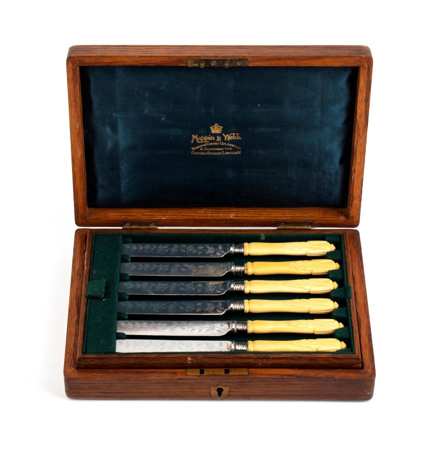 composto da 6 forchette e 6 coltelli con lame in metallo argentato a decori floreali e manici in avorio di elefante (Elephas maximus Linnaeus, 1758 o Loxodonta africana Blumenbach, 1797) contenuti entro custodia originale in legno.