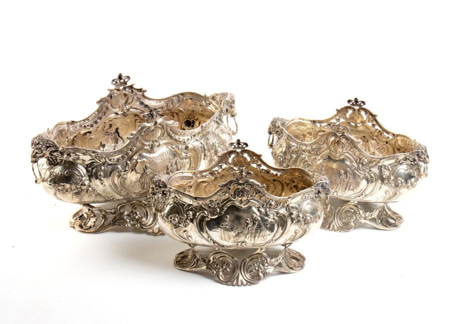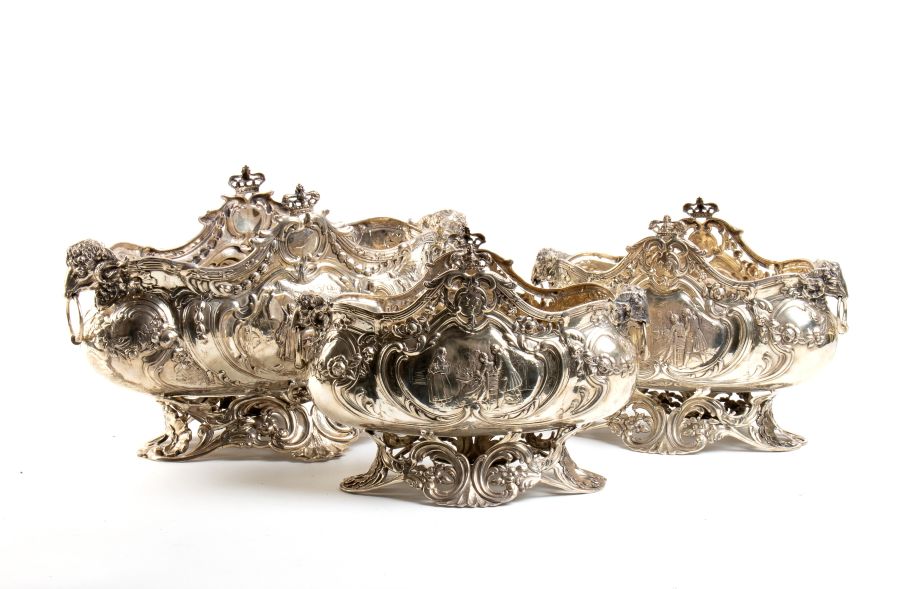 Gruppo di 3 centrotavola tedeschi in argento Hanau, XIX secolo