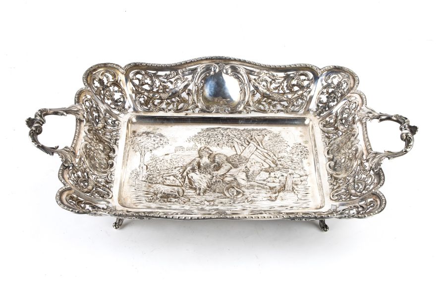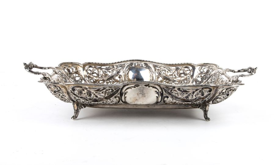 Georg Roth & Co. Cestino tedesco in argento Hanau, fine XIX secolo Altezza x larghezza x profondità: 7 x 40 x 26 cm. Peso: 720 gr.