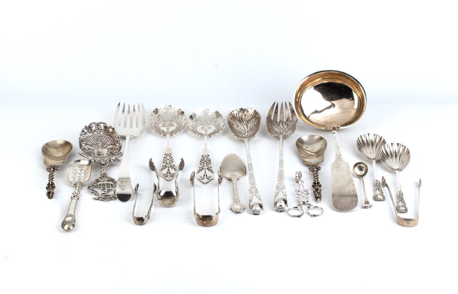7) pinza cucchiai leggermente più grandi della precedente: Argento 925/1000, punzonato con la serie completa di marchi inglesi per l'argento in uso a Londra, 1874-1875, argentiere Henry Holland (of Holland, Aldwinckle & Slater).