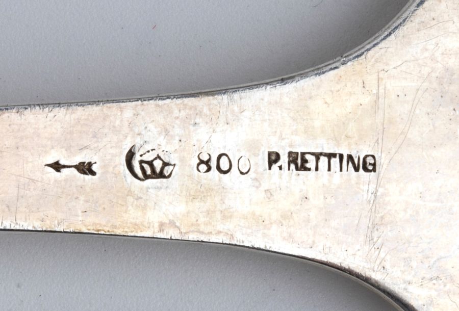 13) mestolo (ramaiolo) di forma ovale: punzonato con i marchi per l'argento in uso in Germania dal 1884, e marchio "800".