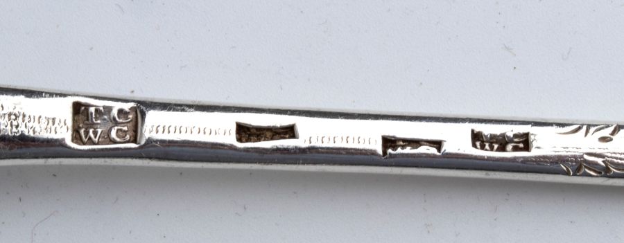 9) coppia cucchiaio e forchettone: marchi provinciali inglesi non identificabili.