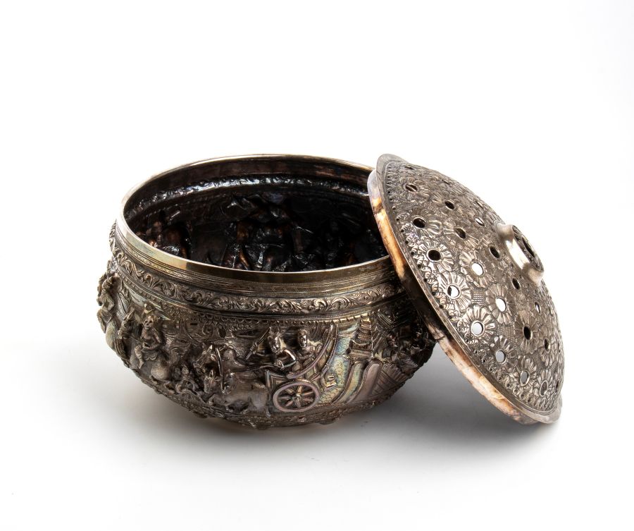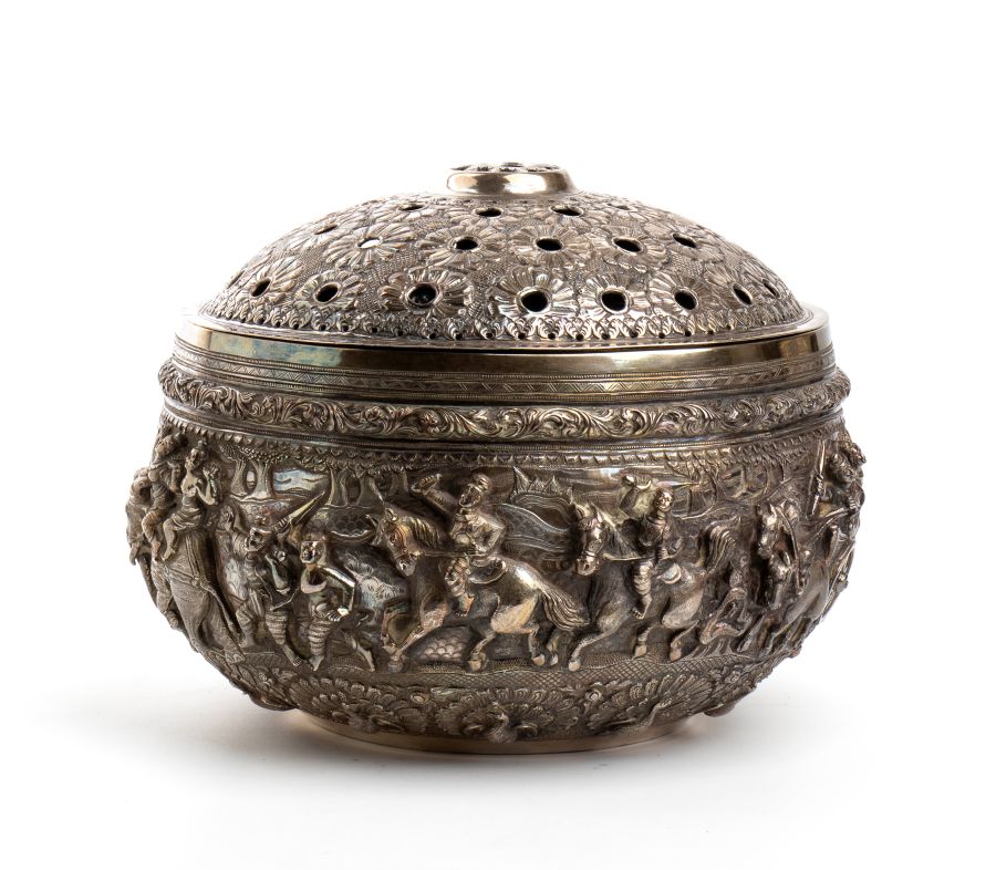 Ciotola Birmana in argento con coperchio XIX secolo Altezza x diametro: 17,5 x 23 cm. Peso: 1466 gr