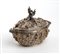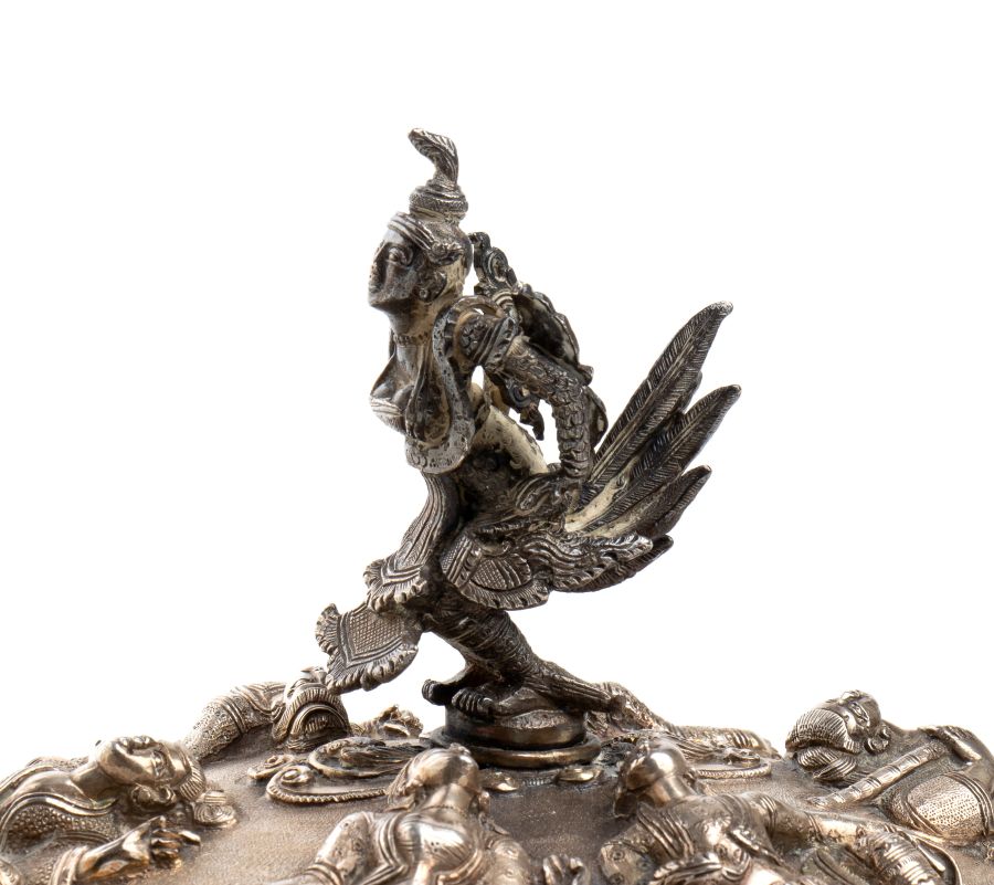 di forma ovale, presenta un coperchio con chiusura ad innesto cimato da una figura mitologica della tradizione birmana, così come il corpo risulta riccamente sbalzato e cesellato con scene tradizionali mitologiche a rilievo e rifinita da numerosi decori.