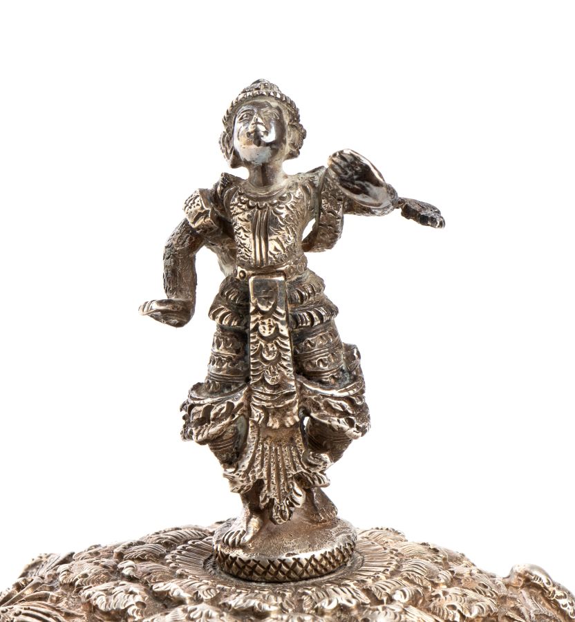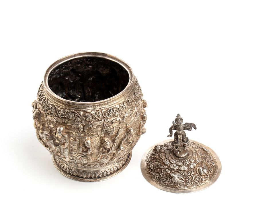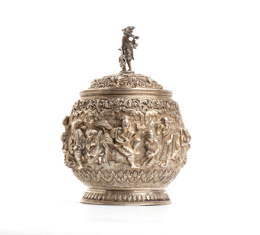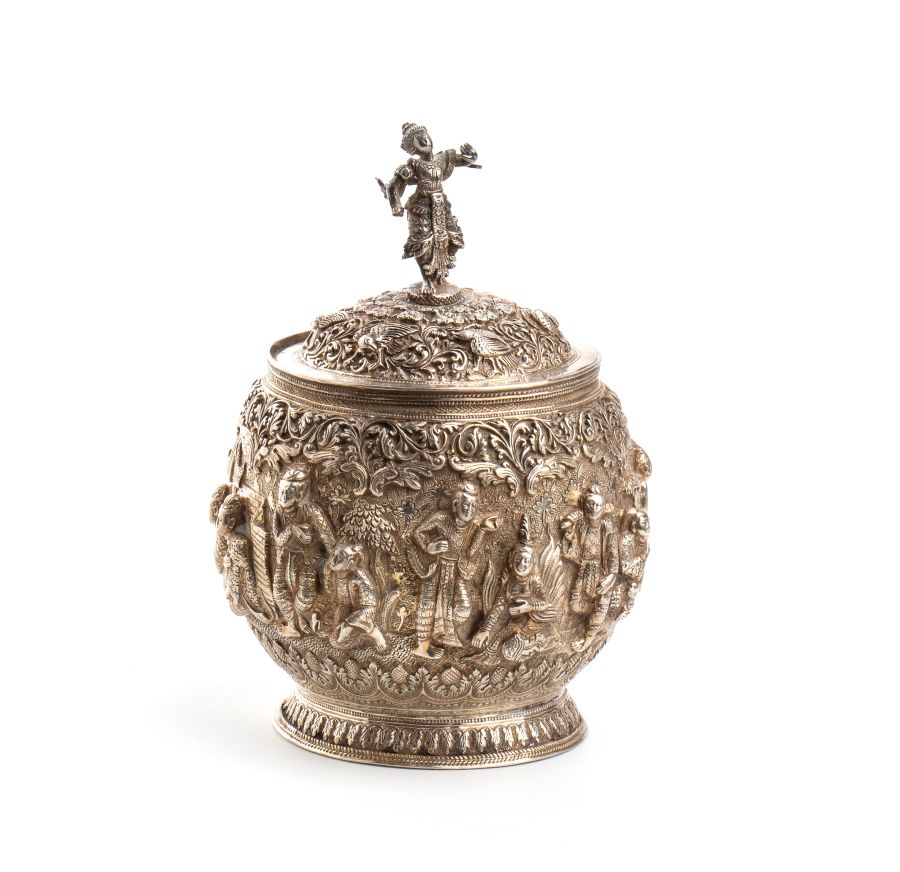 Scatola birmana in argento Birmania, XIX secolo Altezza x diametro: 18,5 x 13,5 cm. Peso: 639 gr