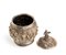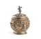 Altezza x diametro: 18,5 x 13,5 cm. Peso: 639 gr di forma circolare, il corpo riccamente sbalzato e cesellato raffigurante scene tradizionali della mitologia birmana e rifinita da numerosi decori fogliati. Presenta un coperchio con chiusura ad innesto cimato da un da una figura mitologica con le ali. Classificazione dello stato di conservazione: **** buono.