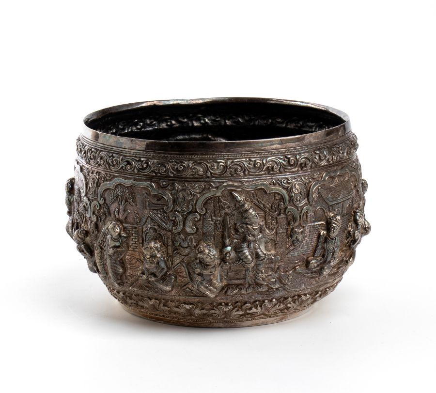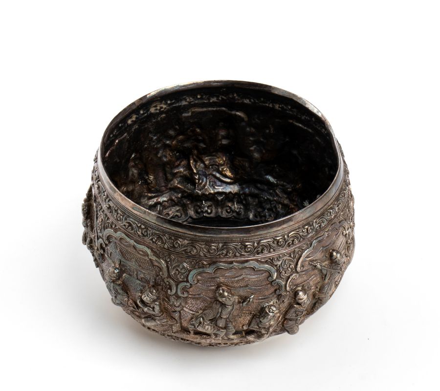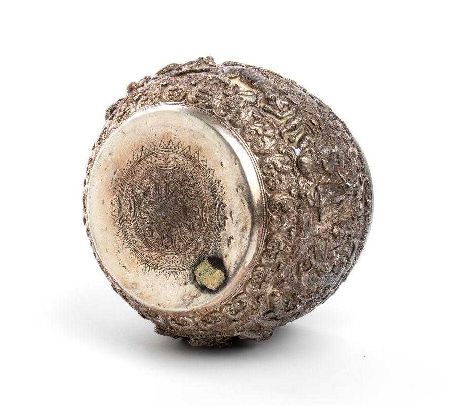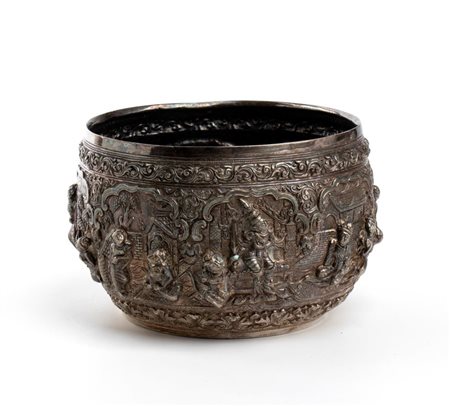 Ciotola Thabeik birmana in argento XIX secolo Altezza x diametro: 9 x 13,7 cm. Peso: 461 gr.