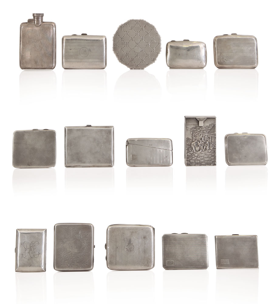 ARGENTI RECENTI DODICI DIVERSI PORTASIGARETTE, UN PORTACIPRIA, UNA FIASCHETTA...
