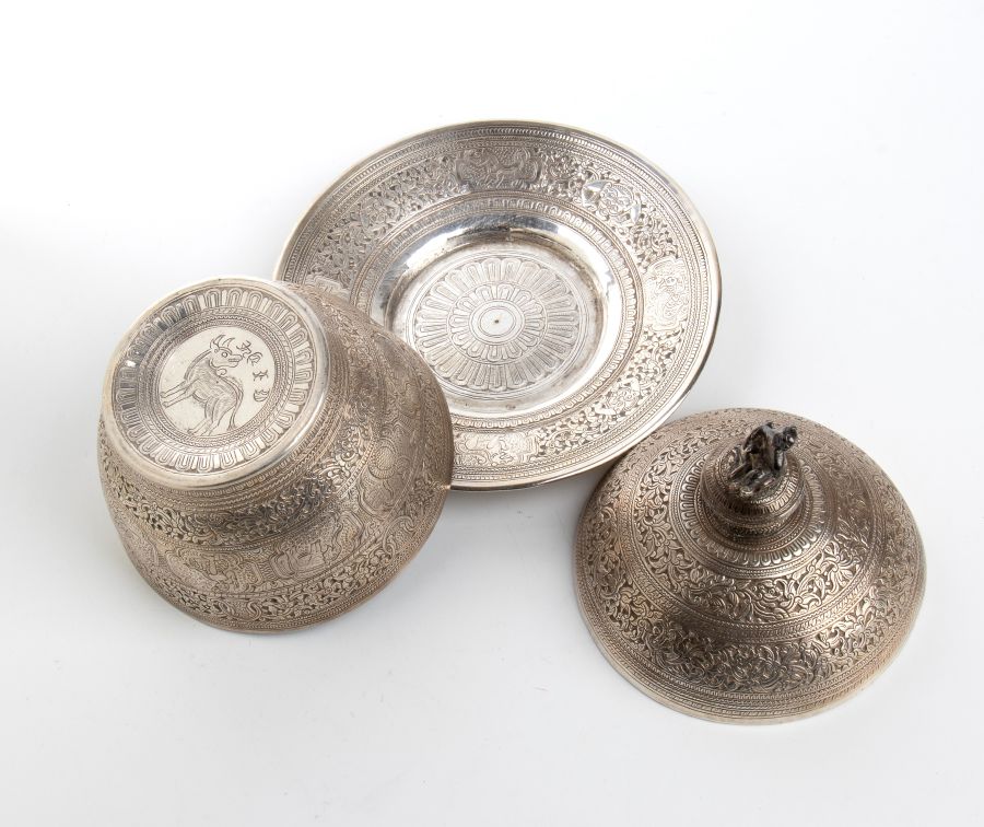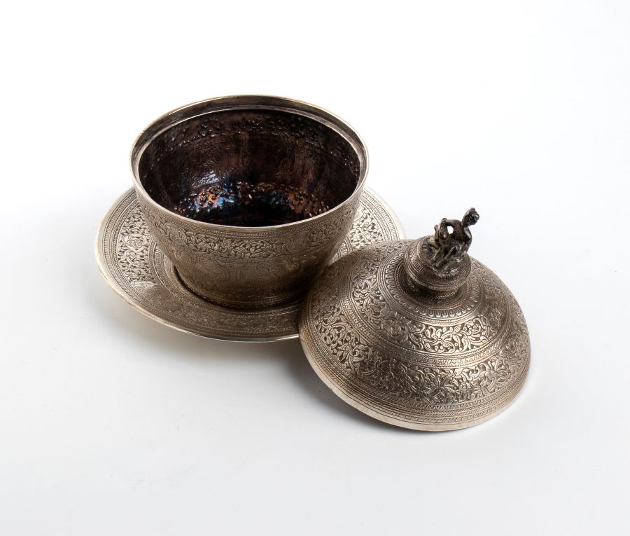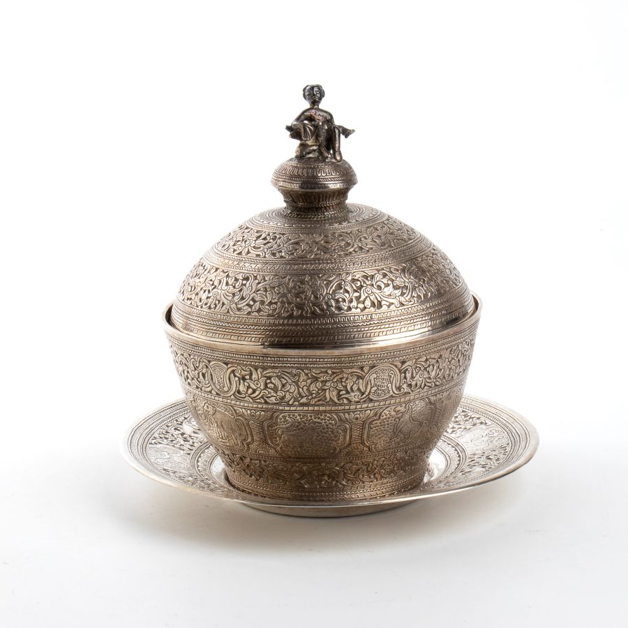 Contenitore indiano con piatto in argento XIX secolo Peso totale: 693 gr.