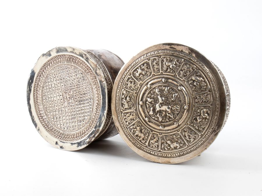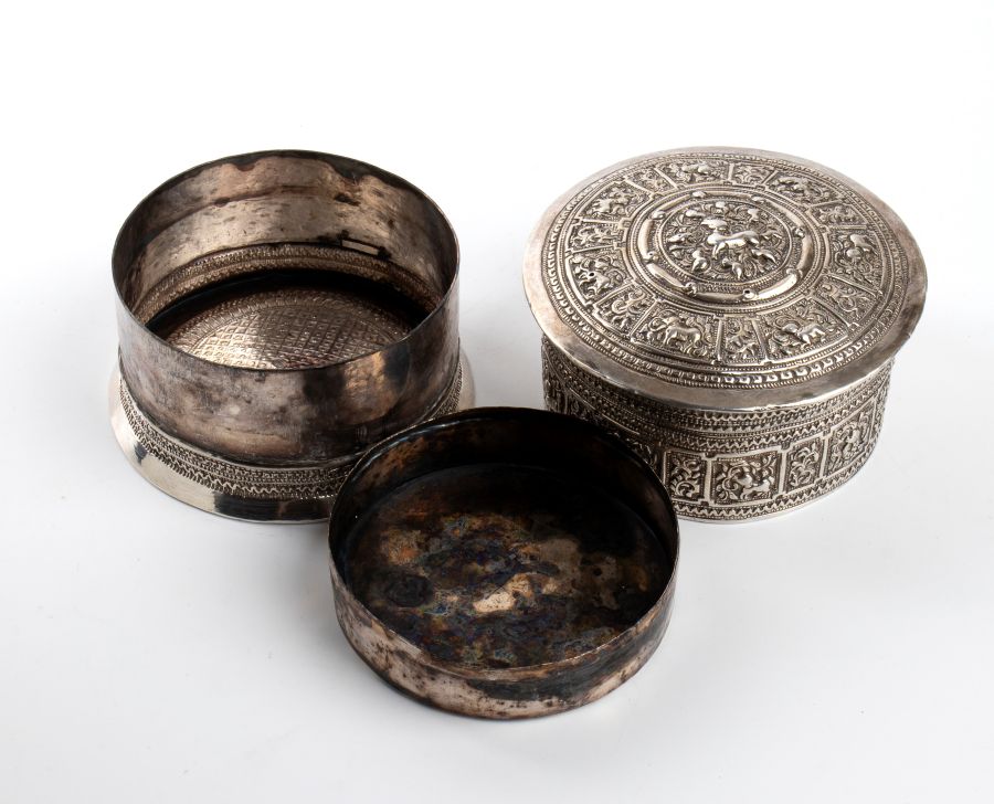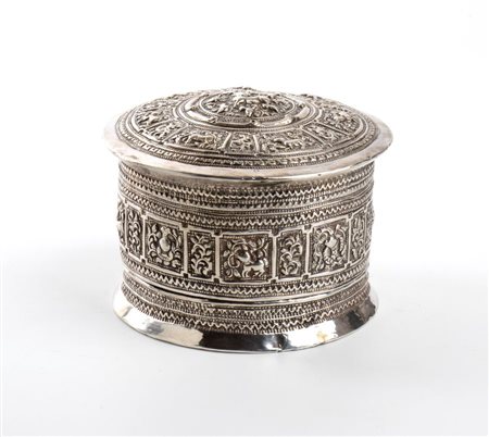 Scatola birmana in argento XIX secolo Altezza x diametro: 8,2 x 11. Peso: 324 gr.