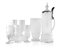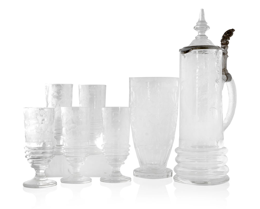 SERVIZIO IN CRISTALLO MOLATO, BOEMIA, INIZIO XX SECOLO, composto da cinque bicchieri e un versatoio con decori a cavalli (crepa e rincollo), unito a un vaso ovoidale di simile decoro.