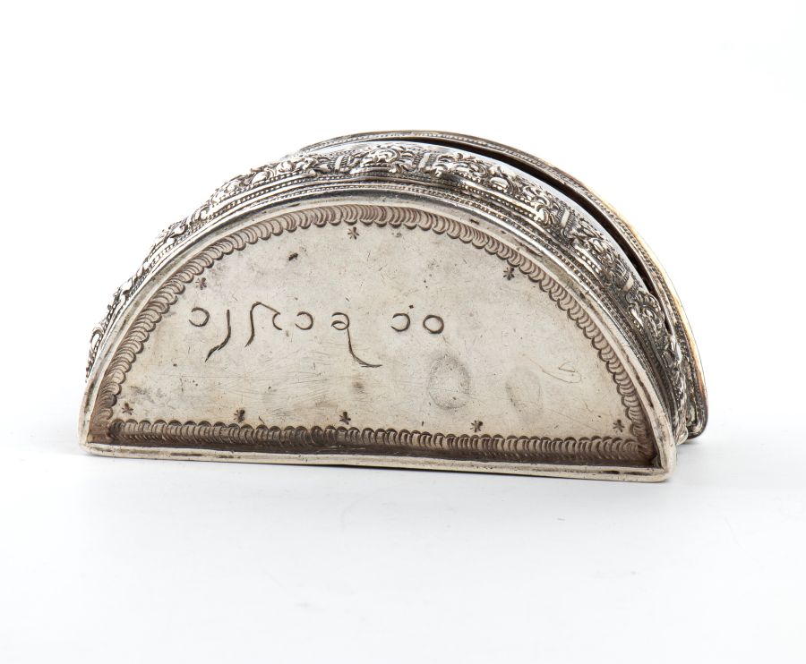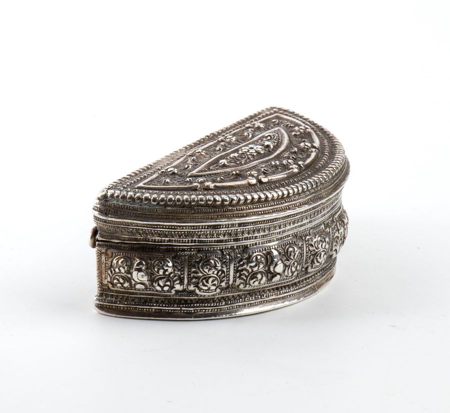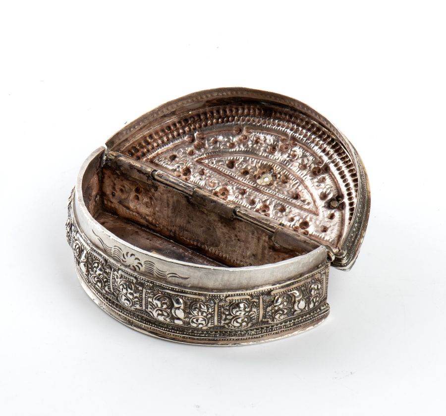 Scatola birmana in argento XIX secolo Altezza x larghezza x profondità: 3,8 x 9,8 x 4,9 cm. Peso: 159 gr.