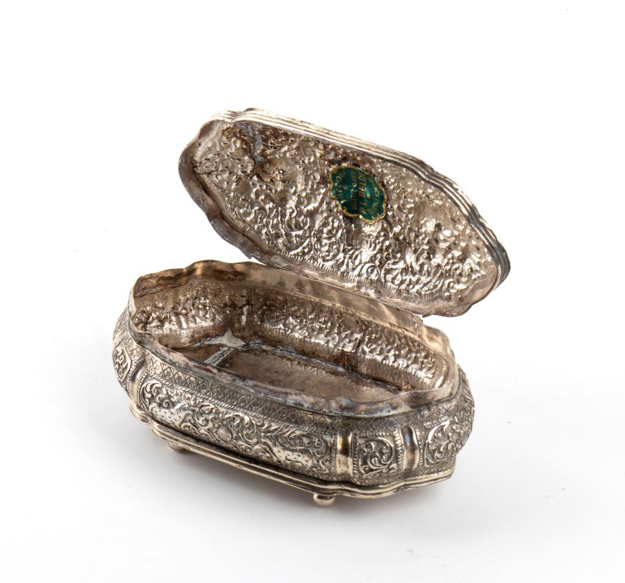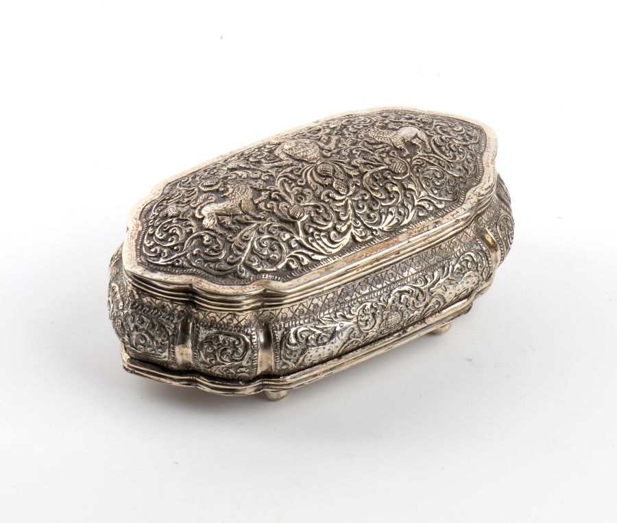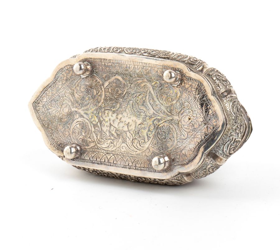 Scatola birmana in argento XIX secolo Altezza x larghezza x profondità: 4,8 x 11,3 x 6,5 cm. Peso: 154 gr.