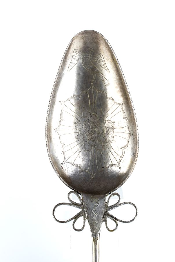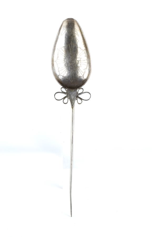 Lungo spillone in argento, il cui nome quechua è "tupu", con la parte superiore a forma di cucchiaio ovale decorato con un motivo floreale e con un uccello in volo.