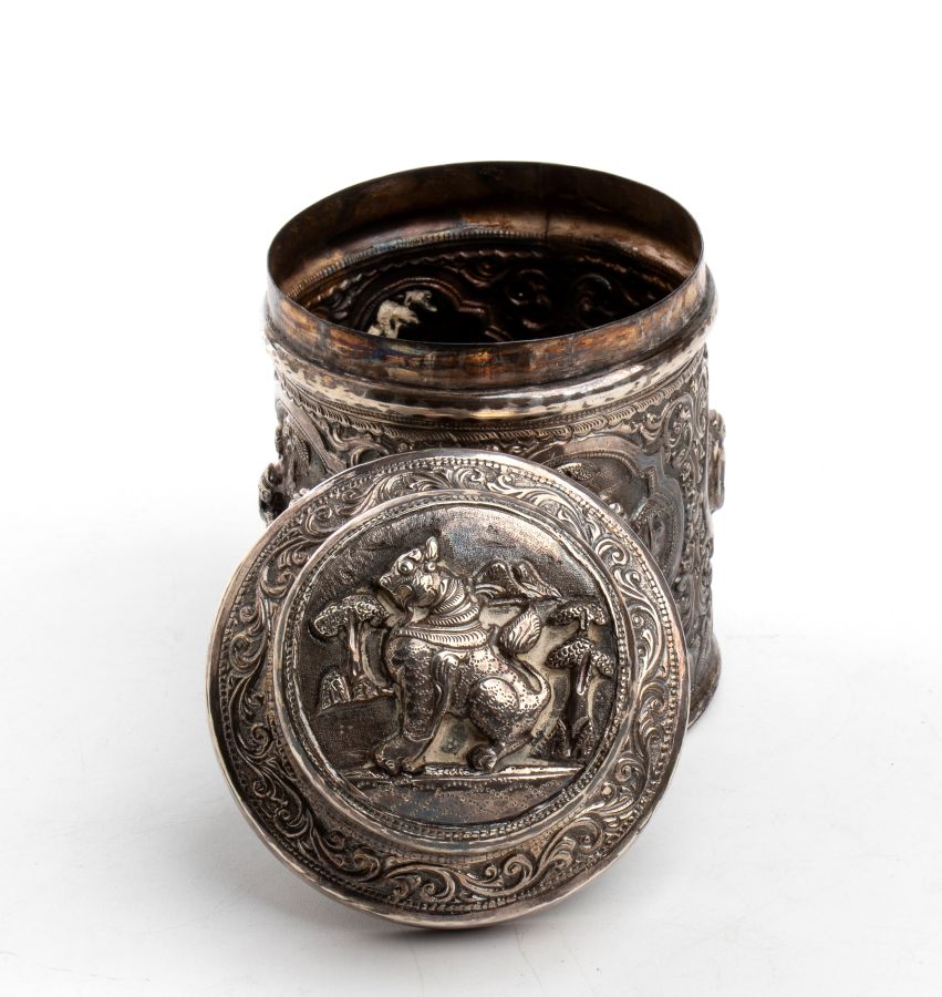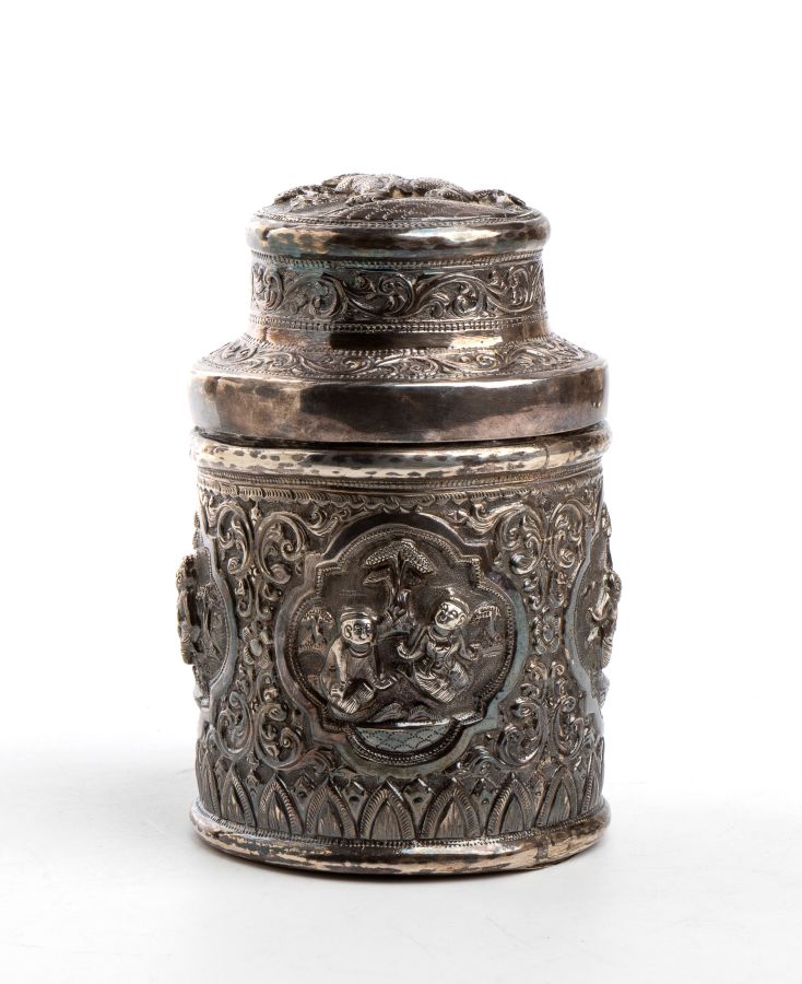 Altezza x diametro: 11,8 x 7,4 cm. Peso 152 gr di forma circolare con coperchio ad innesto, riccamente sbalzato e cesellato con figure tradizionali della cultura birmana. Classificazione dello stato di conservazione: **** buono.