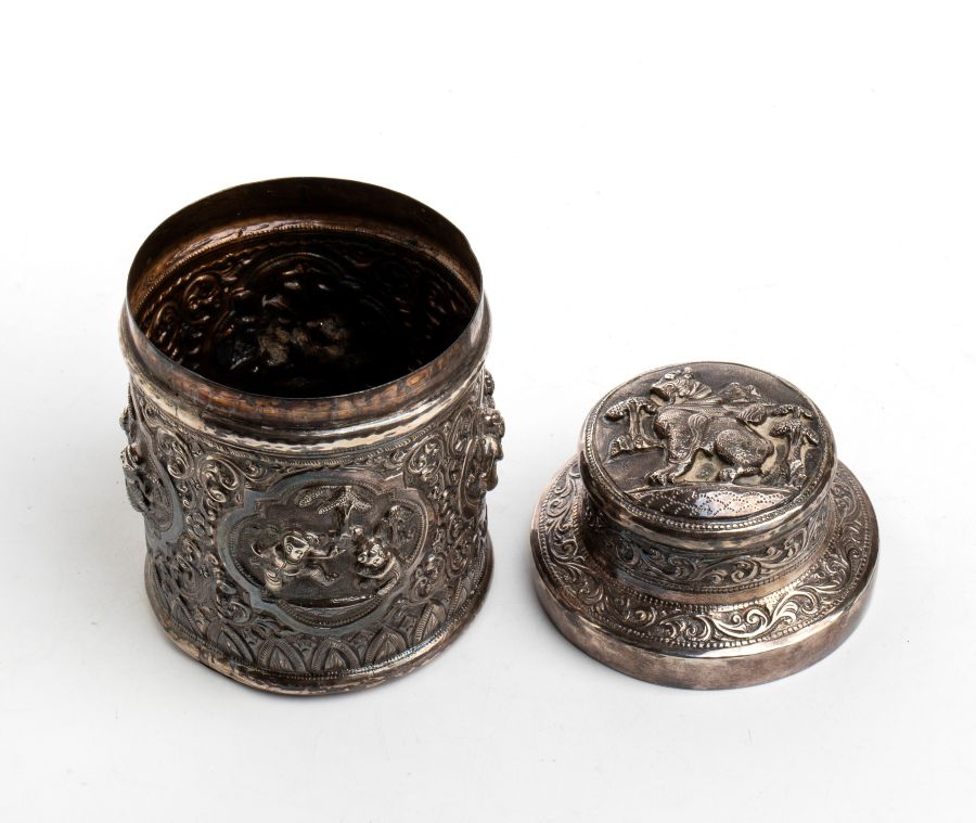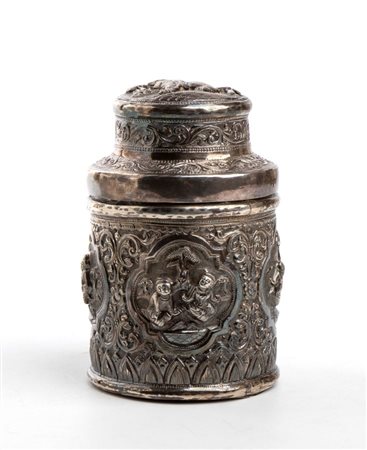 Barattolo birmano in argento XIX secolo Altezza x diametro: 11,8 x 7,4 cm. Peso 152 gr