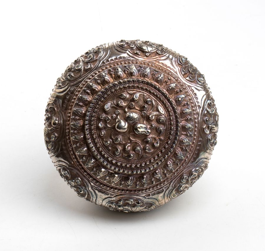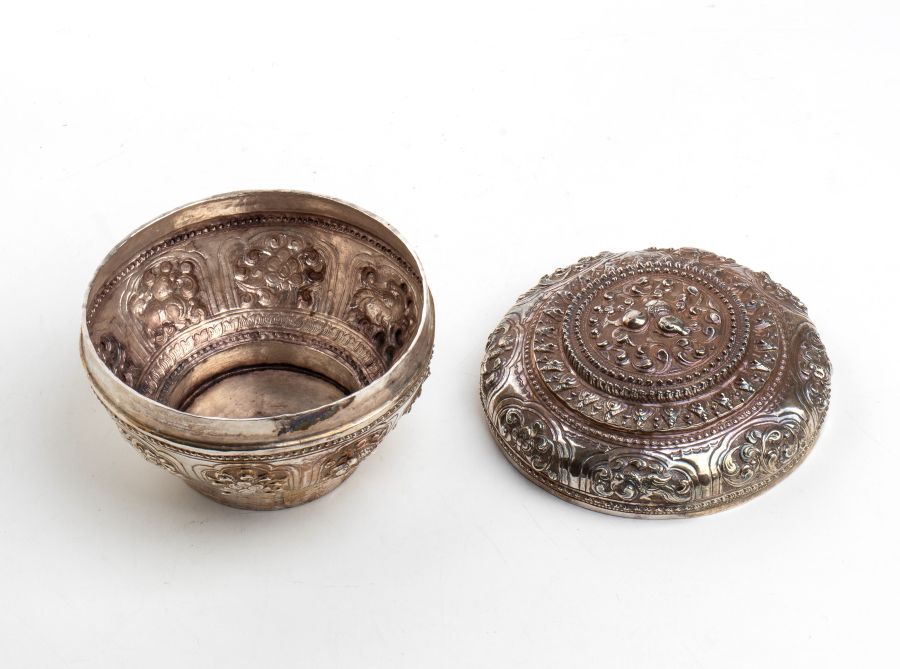 Scatola birmana in argento XIX secolo Altezza x diametro: 8,8 x 13,3. Peso: 152 gr