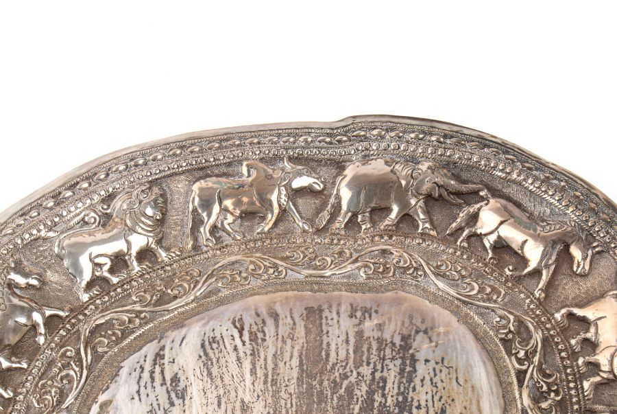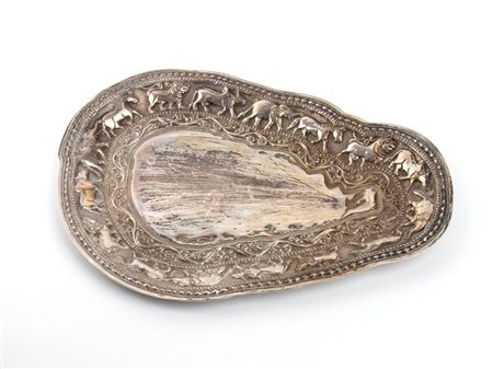 Vassoio indiano in argento XIX secolo Larghezza x profondità: 30 x 22 cm. Peso: 246 gr.