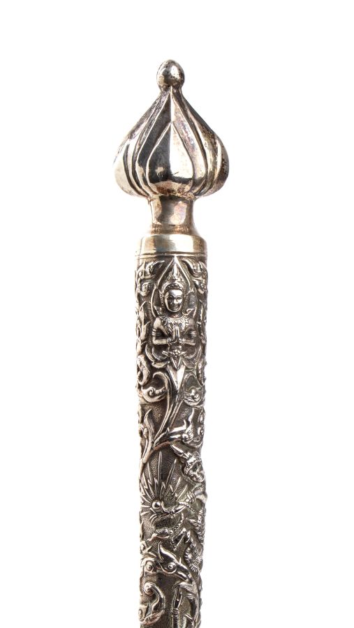 Dimensioni: 23 x 8,3 cm. Peso: 151 gr riccamente decorato con figure tipiche della tradizione birmana alternato a volute fogliate. Classificazione dello stato di conservazione: **** buono.