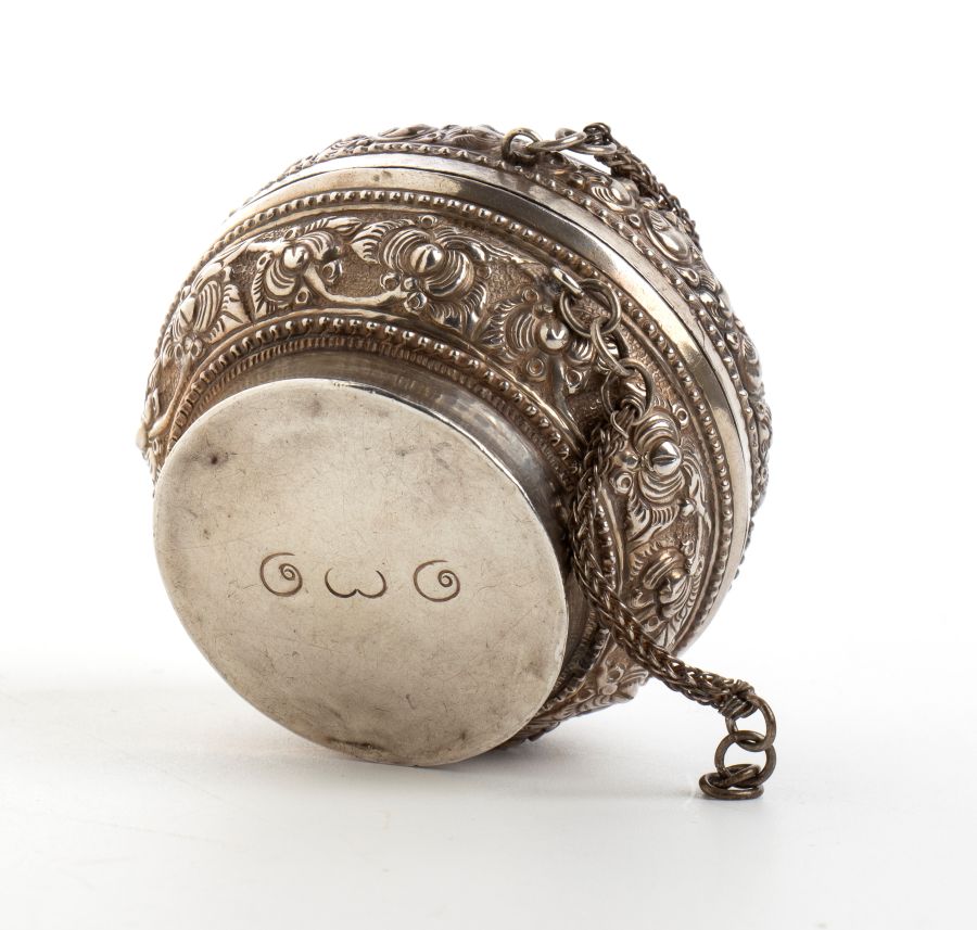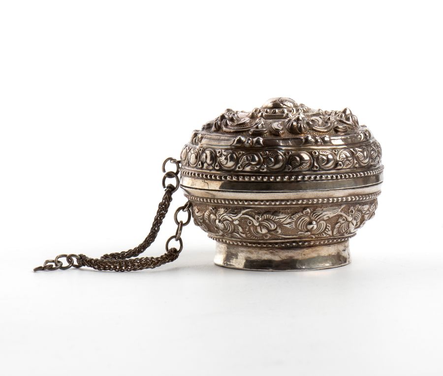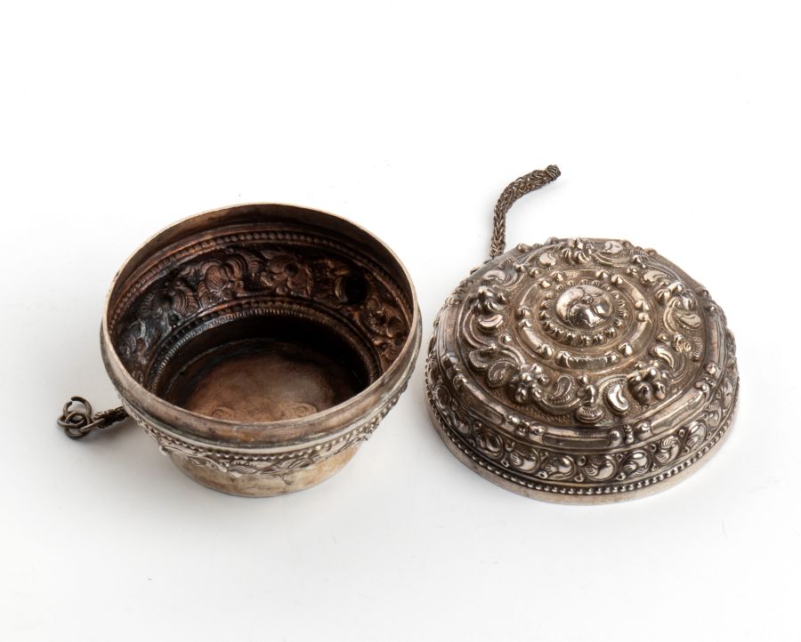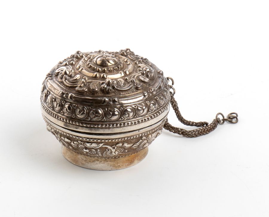 Scatola birmana in argento XIX secolo Altezza x diametro: 4,5 x 5,6. Peso: 39 gr.