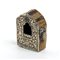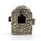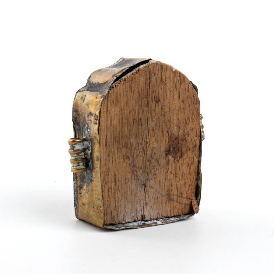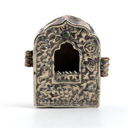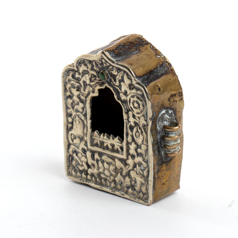 Altezza x larghezza x profondità: 7,2 x 6,8 x 2,4 cm. Peso totale (con parte retrostante in legno): 37 gr. Il corpo principale è realizzato in rame, mentre il pannello frontale, riccamente decorato, è in argento lavorato. La lavorazione dell’argento è caratterizzata da un’elaborata decorazione floreale, eseguita con tecniche di cesellatura che mettono in risalto dettagli ornamentali, come fiori stilizzati e motivi ricorrenti. Al centro del pannello frontale si trova una nicchia a forma di arco lobato, tipico dello stile tibetano, che costituisce lo spazio sacro per ospitare l’immagine di una divinità, di un maestro spirituale o una tsa tsa votiva. La nicchia è contornata da motivi floreali intrecciati, che simboleggiano l’interconnessione della natura con il divino.