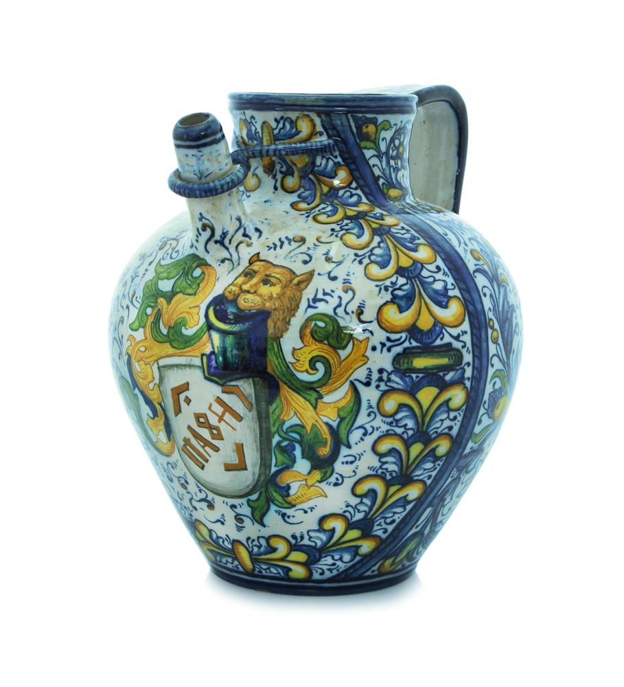 GRANDE ORCIOLO IN CERAMICA, MOLARONI, PESARO, FINE XIX SECOLO, decoro policromo con leone reggente scudo entro festoni fioriti; marca "Molaroni Pesaro" in blu.