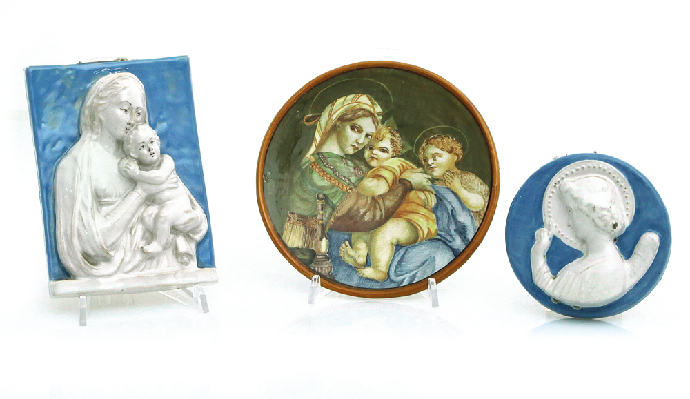 TRE PLACCHE IN CERAMICA, MOLARONI, PESARO, FINE XIX SECOLO, di cui una policroma con Madonna della Seggiola e due bianche e blu con testa d'angelo e Vergine con Bambino; marca "Molaroni Pesaro" in blu.