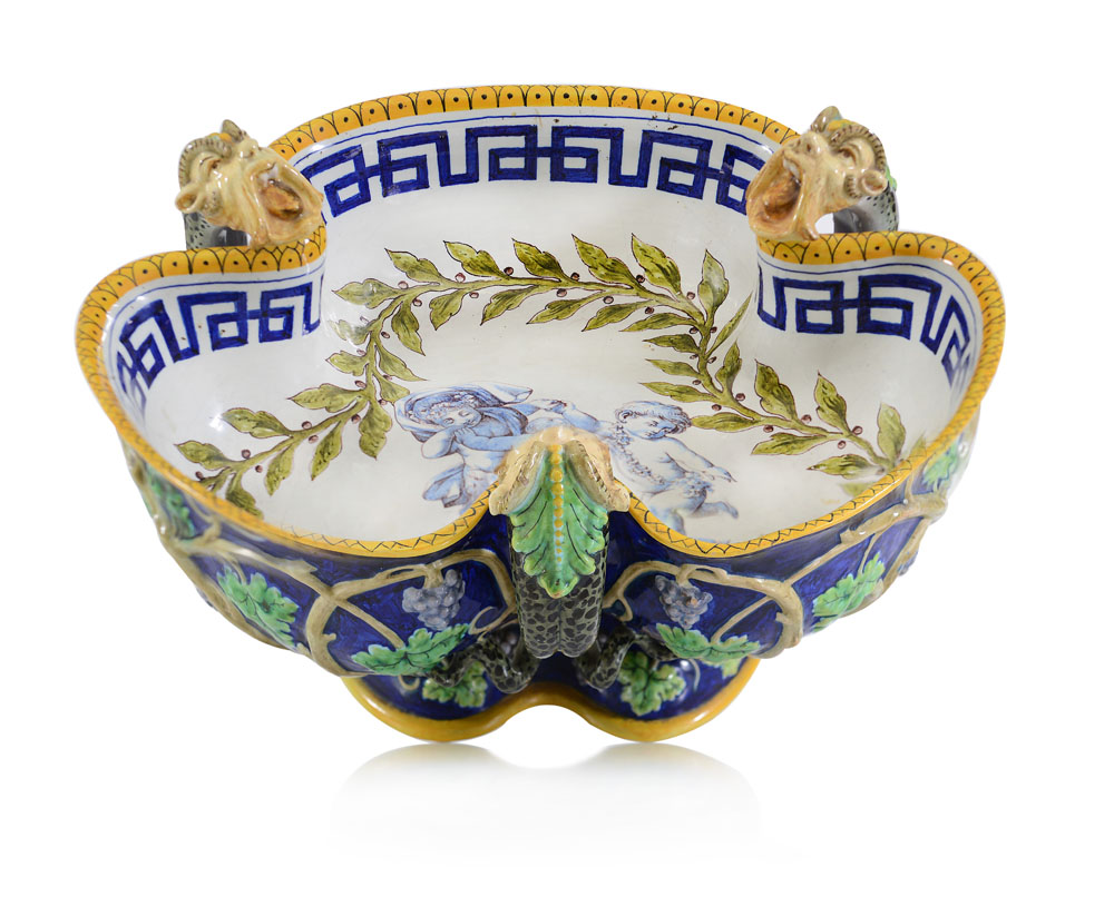 CENTROTAVOLA IN CERAMICA, GINORI, XIX SECOLO, trivalve con tre anse a mascheroni e tralci di vite a rilievo, cavetto decorato a con putti e fauno; marca "Ginori" coronata e numerali in blu; lievi sbeccature.