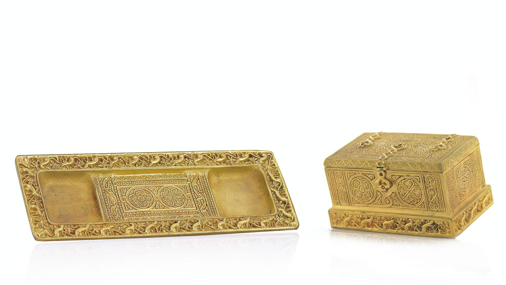 SET DA SCRIVANIA IN BRONZO DORATO, TIFFANY STUDIOS NEW YORK, 1900 CA., composto da calamaio con coperchio incernierato e vassoio, decoro "Veneziano" a rilievo e inciso con motivi geometrici e animali; marchio impresso "Tiffany Studios New York" e numerali su ogni pezzo; calamaio con una vaschetta interna mancante.