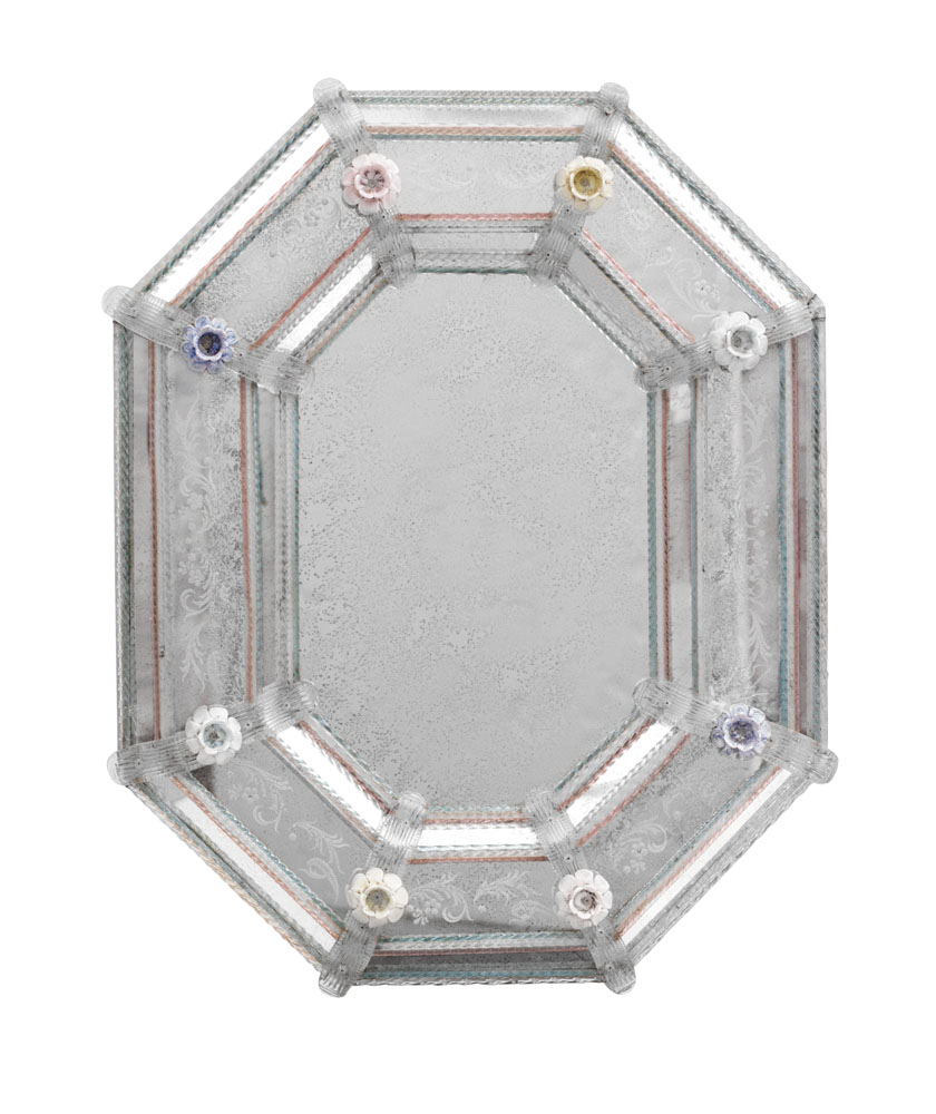 SPECCHIERA OTTAGONALE CON APPLICAZIONI, MURANO, XX SECOLO, decori incisi e applicazioni policrome.