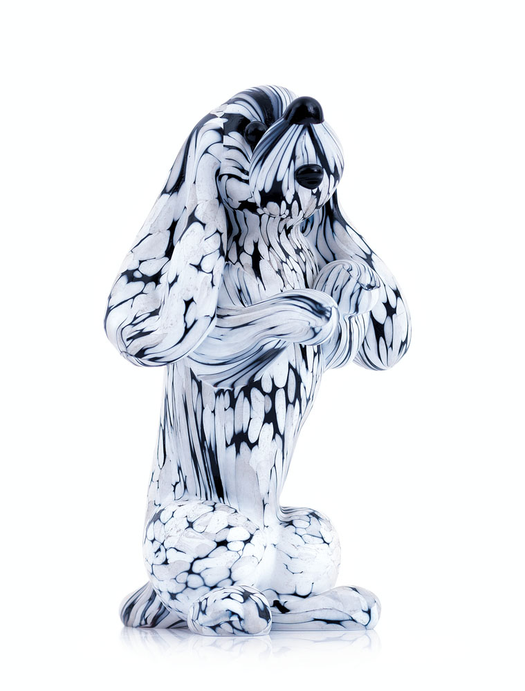 SCULTURA IN VETRO MASSICCIO MACULATO, A.SEGUSO, ANNI '50, raffigurante cane bianco e nero.