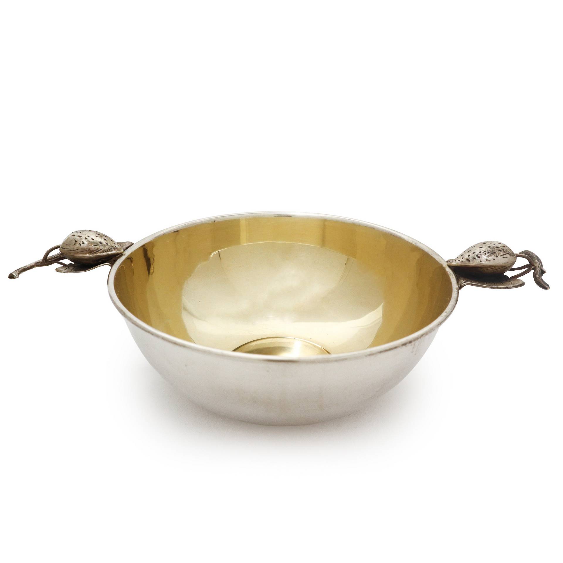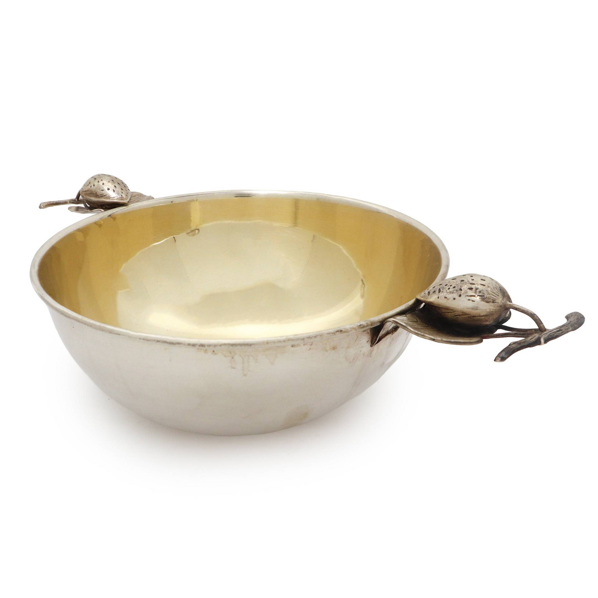 Ciotola in argento vermeil con prese laterali con frutti h cm 9 diametro cm 19 gr. 398