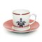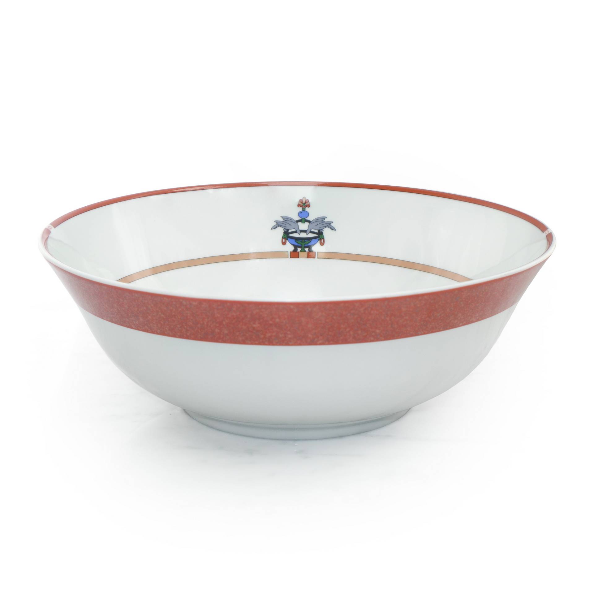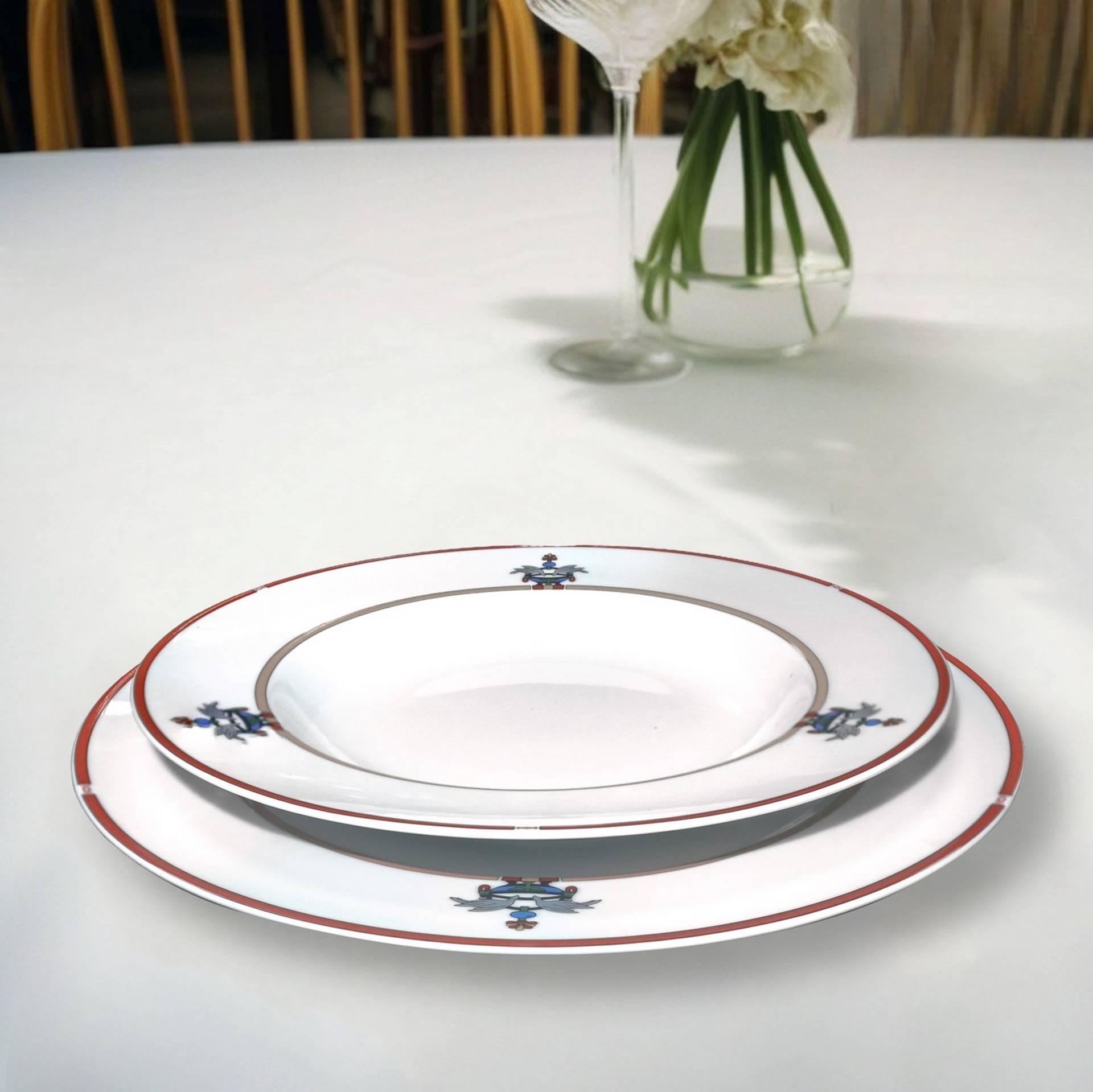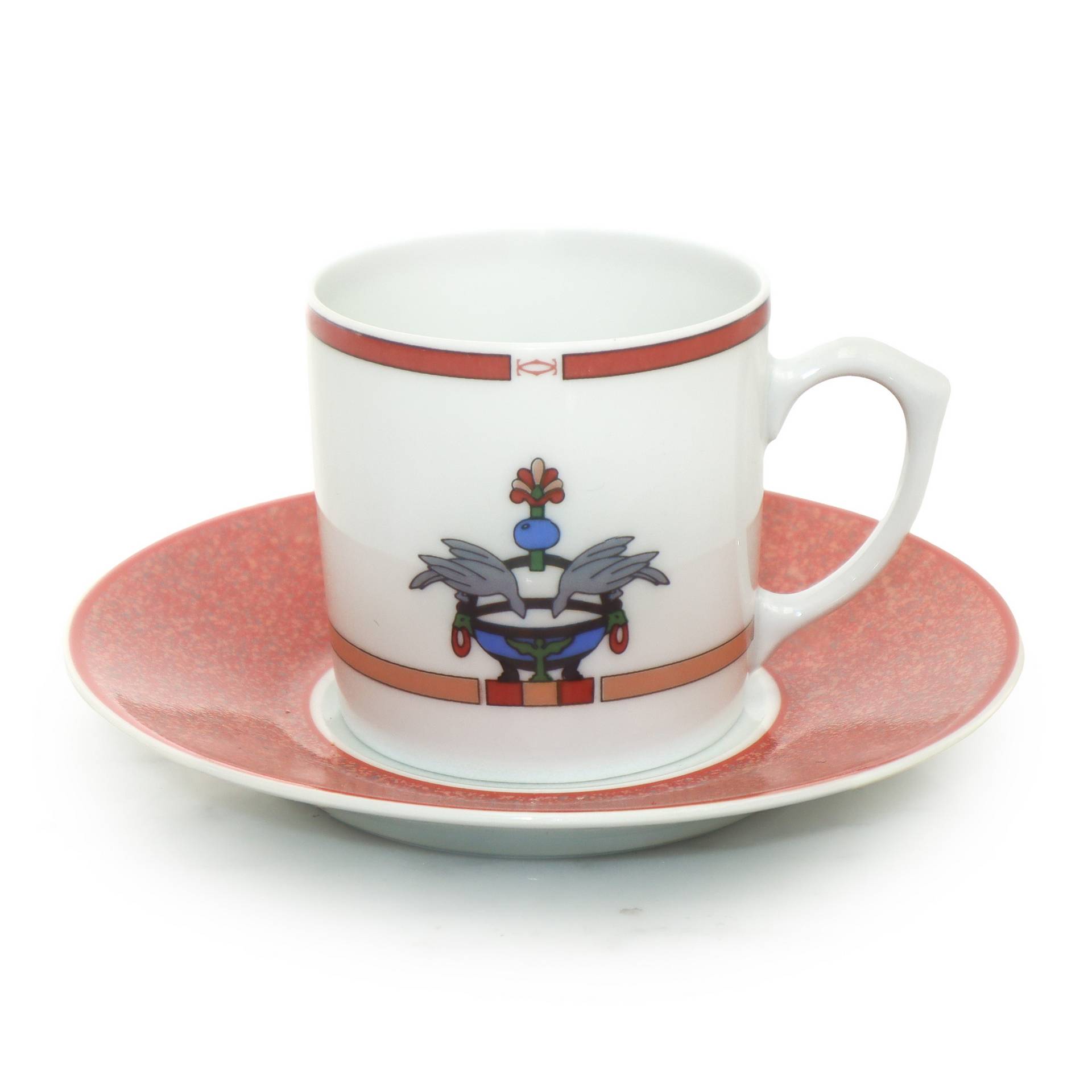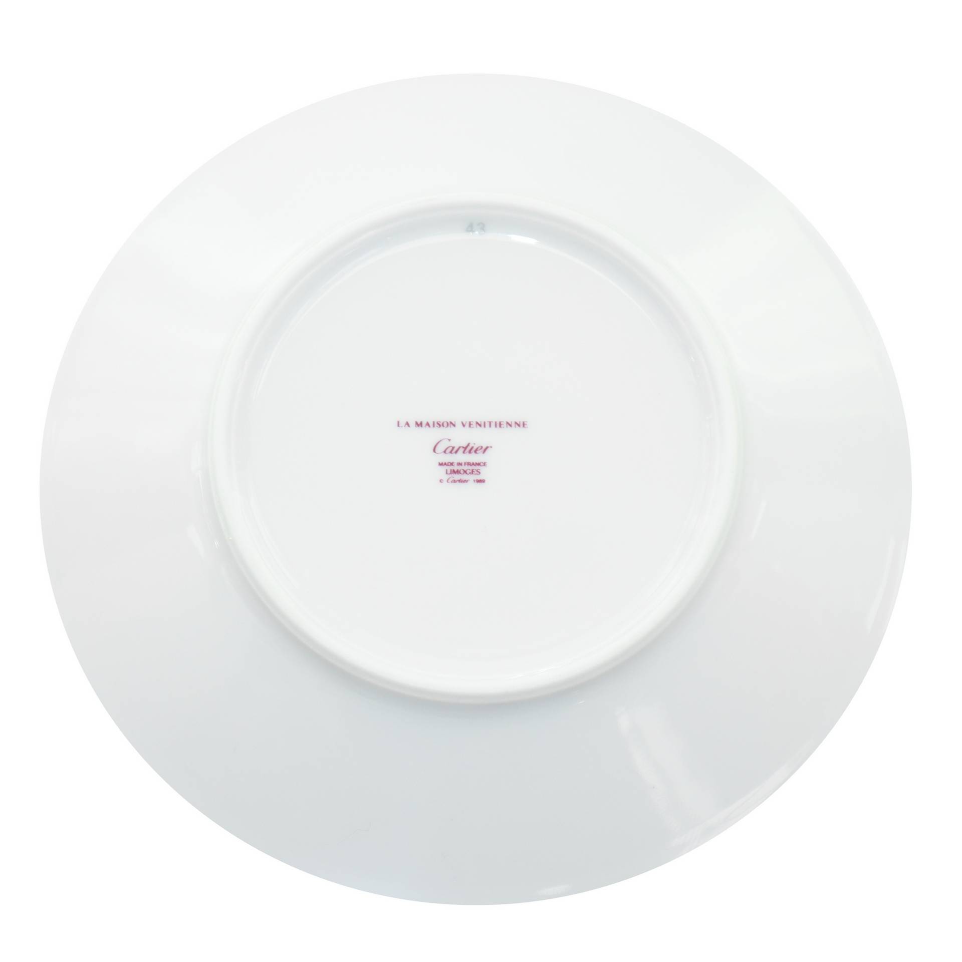 Cartier - Completissimo servizio in porcellana di Limoges bianca e corallo La Maison Venitienne, con decoro centrale in smalti policromi raffigurante due colombe.