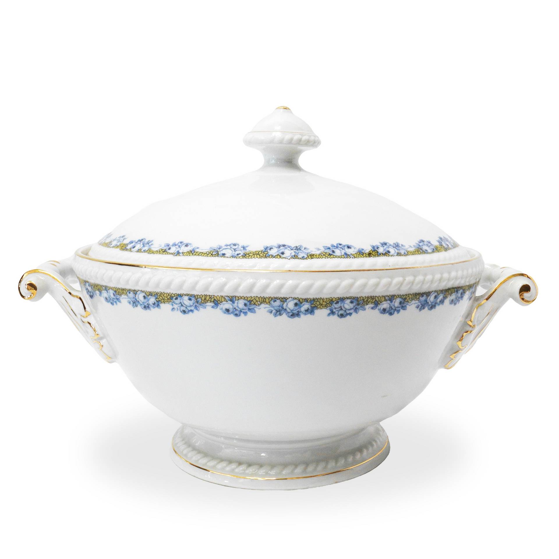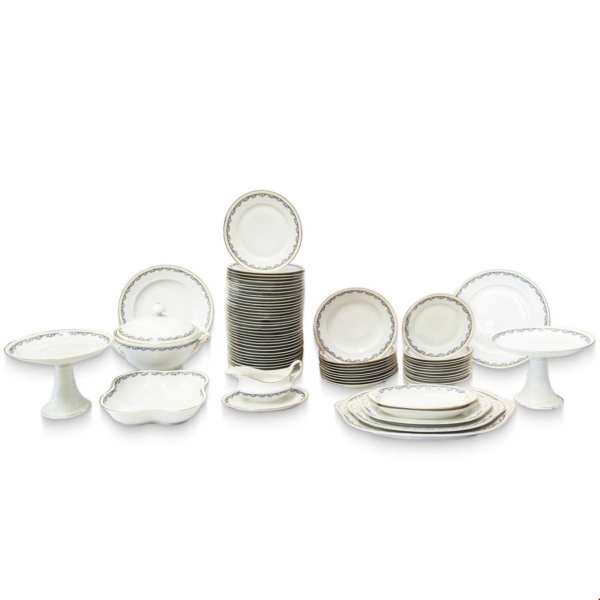 Servizio composto da: 35 piatti piani, 10 piatti fondi, 11 piatti dolce, 1 salsiera, 5 piatti da portata ovali da varie dimensioni, 2 piatti da portata tond, 2 alzate, 1 zuppiera, 1 portadolci.