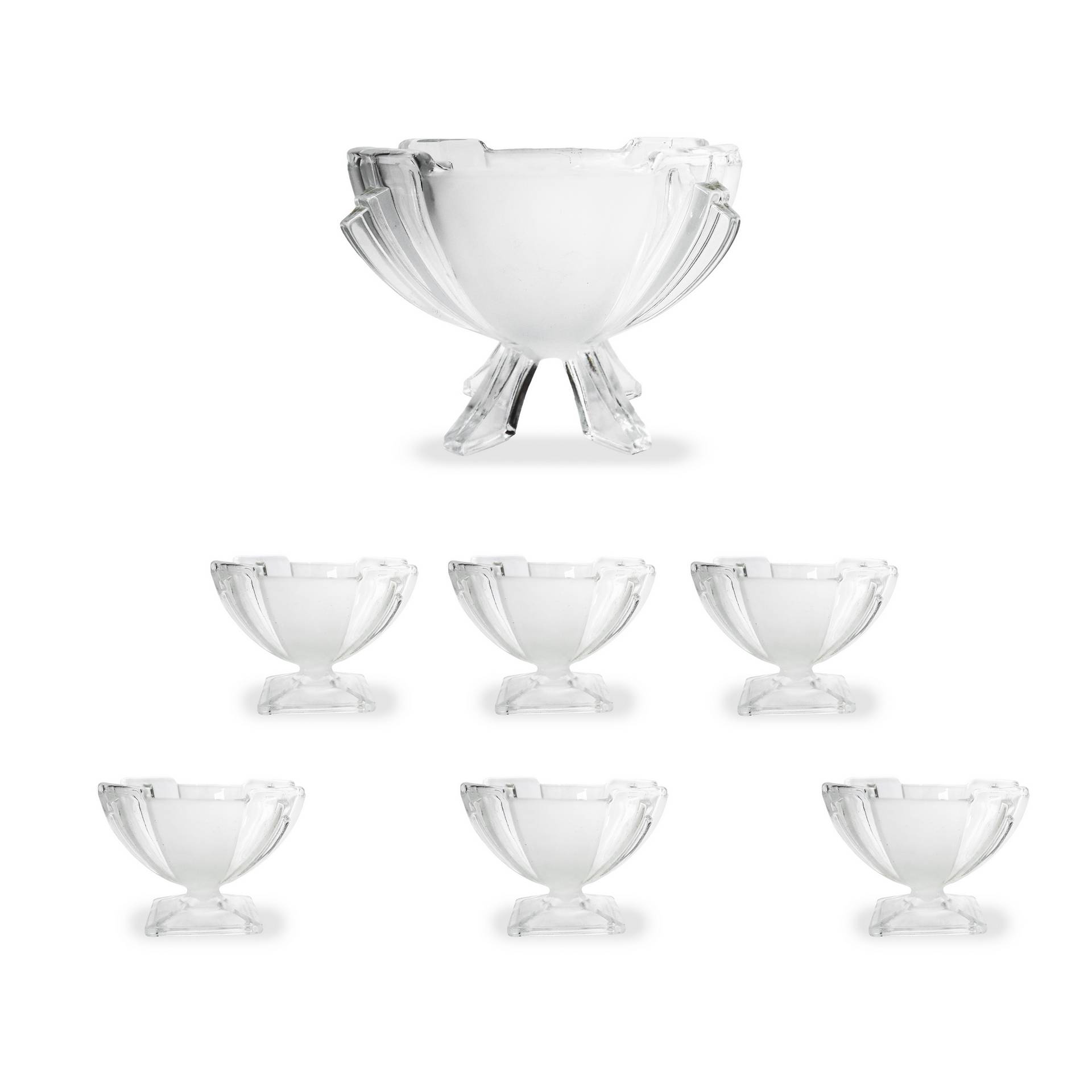 Sowerby - Servizio da macedonia in vetro pressato ciotola H cm 14,5x20 - ciotoline H cm 7,5x11 Composto da Ciotola e 6 coppette con piede quadrato. Una ciotolina è leggermente scheggiata al bordoComposto da Ciotola e 6 coppette con piede quadrato. Una ciotolina è leggermente scheggiata al bordo