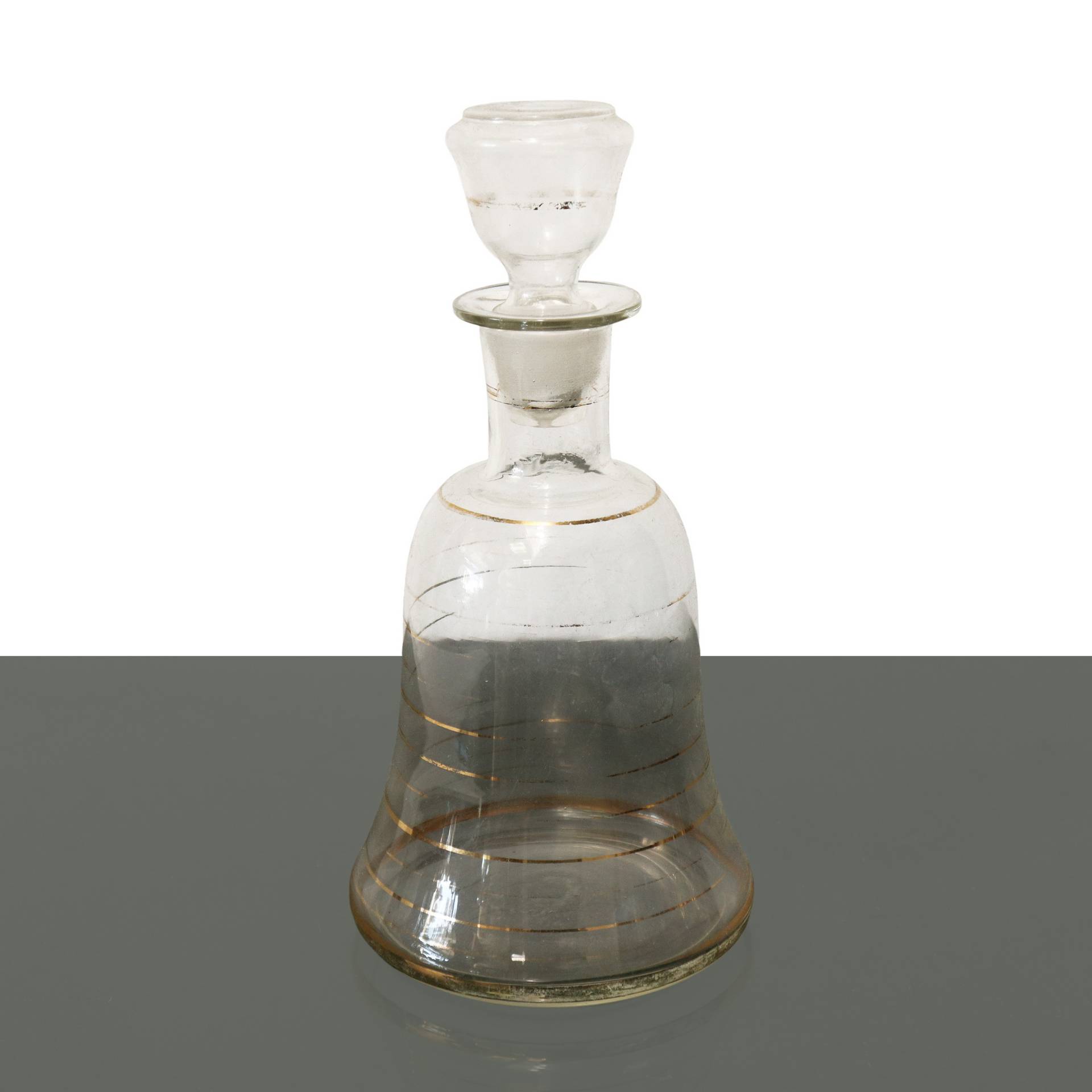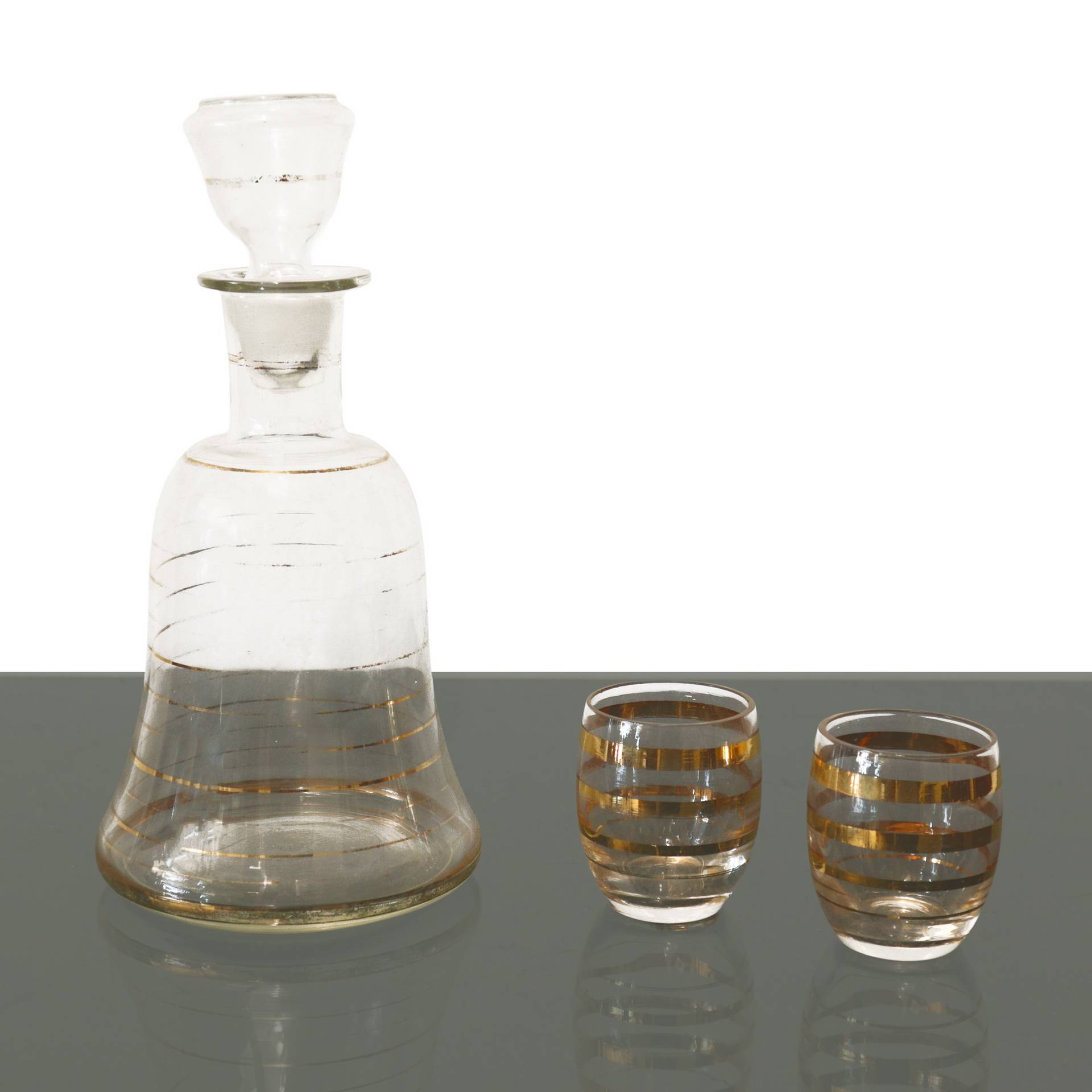 Bottiglia da liquore con perfili dorati con due piccoli bicchieri abbinati