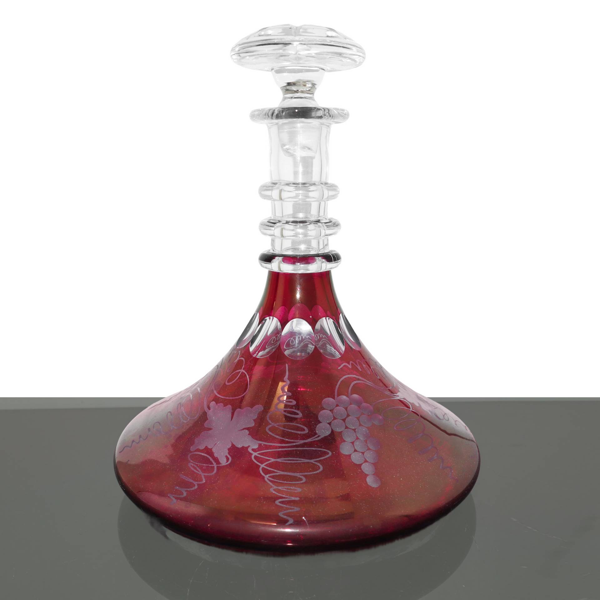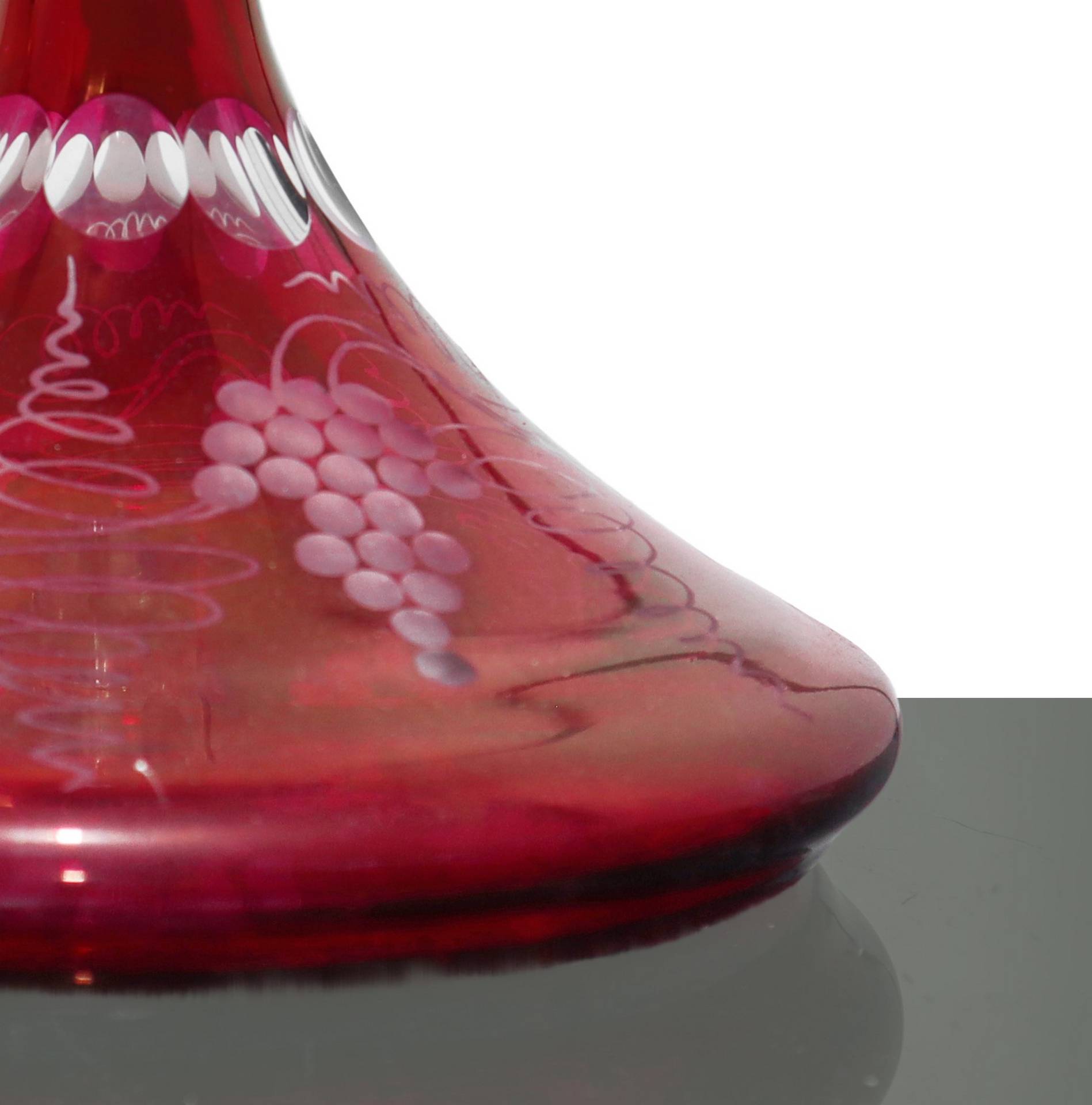 Decanter in vetro colorato e decorato a tralci e foglie d'uva h cm 26,5