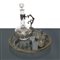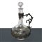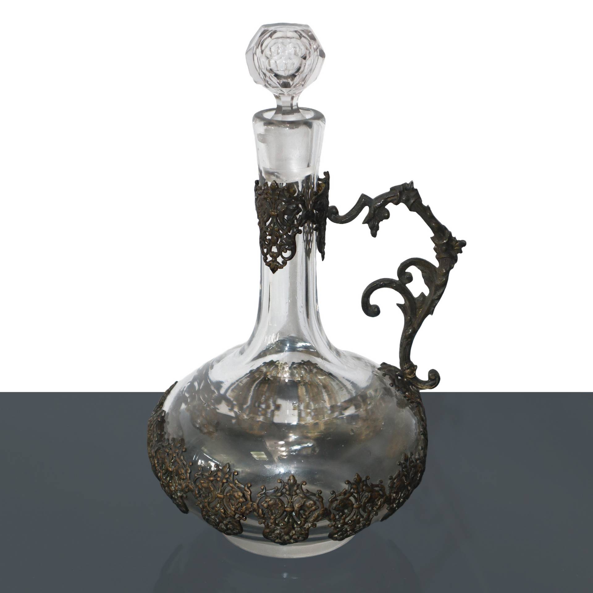 Piatto con bottiglie e bicchierini da liquore in vetro con decorazione in ottone