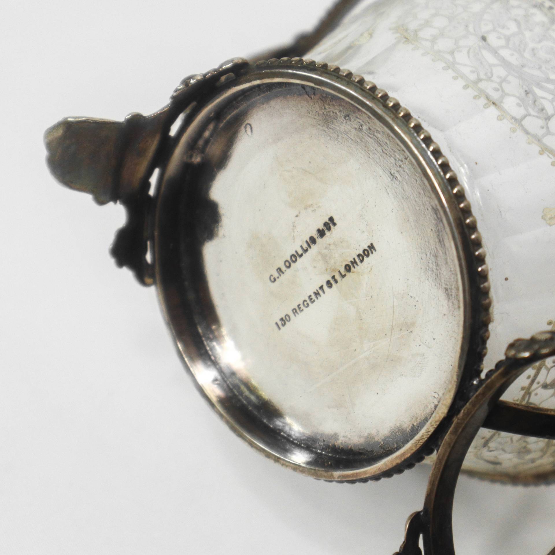 Salsiera in silver e vetro decorato h cm 24,5 iscrizione sul fondo G.R.COLLIG 130 REGENT ST.LONDON iscrizione sul fondo G.R.COLLIG 130 REGENT ST.LONDON
